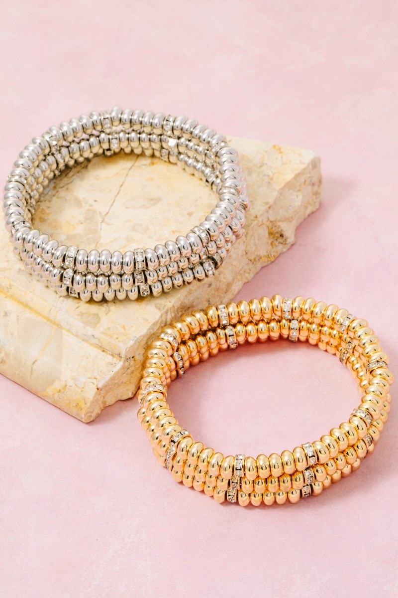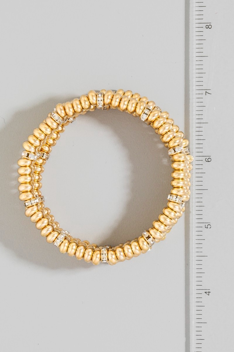 - This bracelet brings a stunning rhinestone and metallic disc beaded set style. Delight in the intricate details that make this bracelet an essential element in expressing your fashion identity.