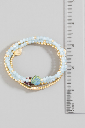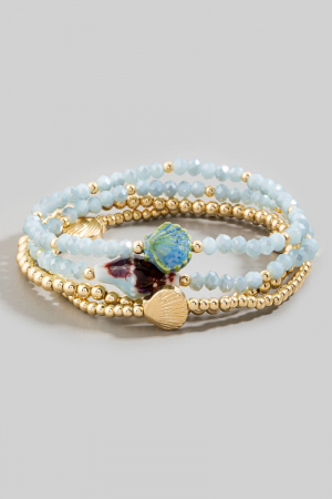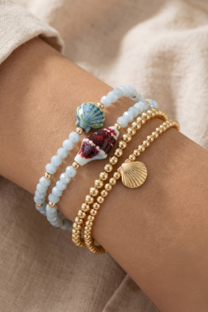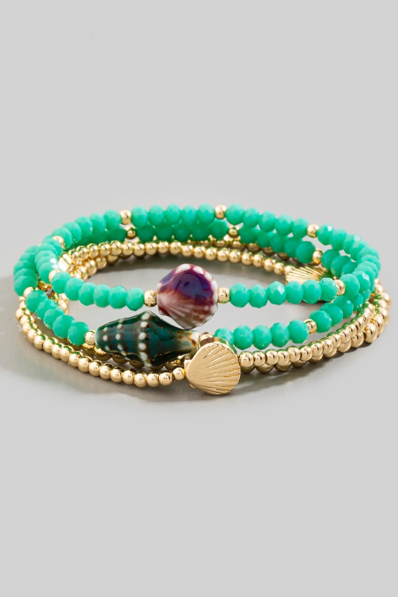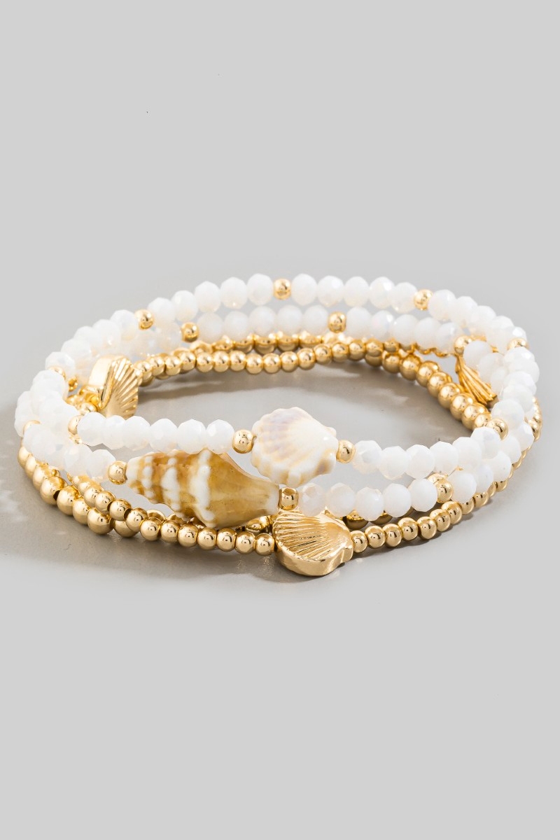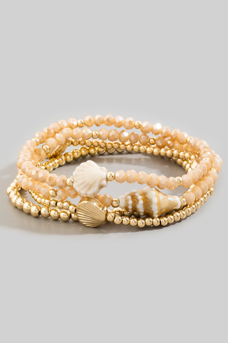 - This bracelet displays a fashionable shell charms faceted and metallic beaded set style. Indulge in the allure of exquisite craftsmanship as this bracelet effortlessly adds a touch of luxury to your attire.