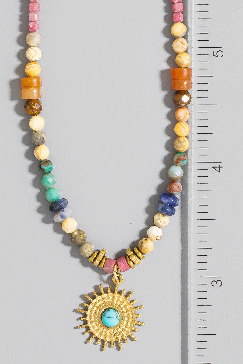 • This necklace showcases a timeless turquoise stud sun pendant mixed beaded style. Experience refined sophistication with this understated yet stylish piece.