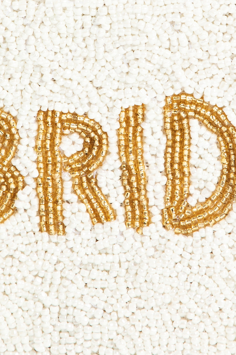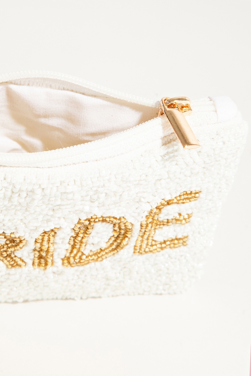 - This showcases a unique gold bride print white beaded coin purse style. Witness the perfect fusion of style and functionality as this effortlessly complements your lifestyle.