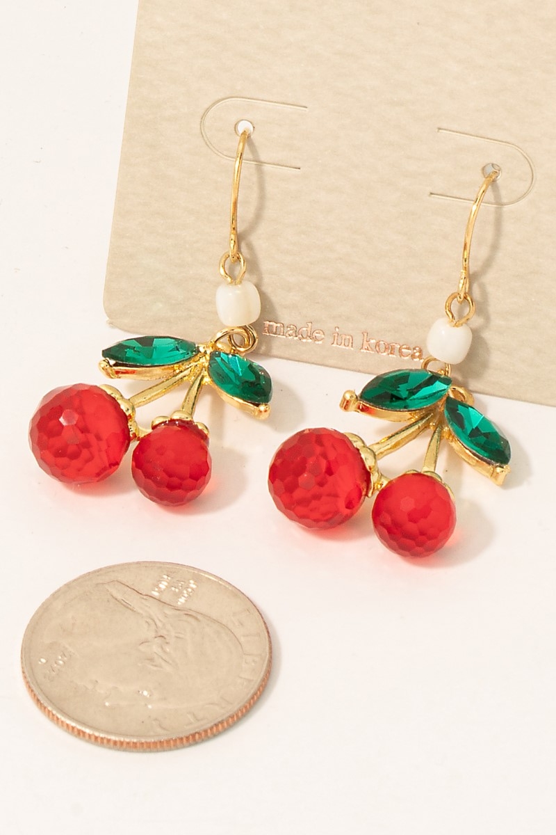 - This pair of earrings displays a fashionable faceted glass beaded cherry dangle chain style. Celebrate the art of accessorizing with this piece that effortlessly encapsulates modern trends.