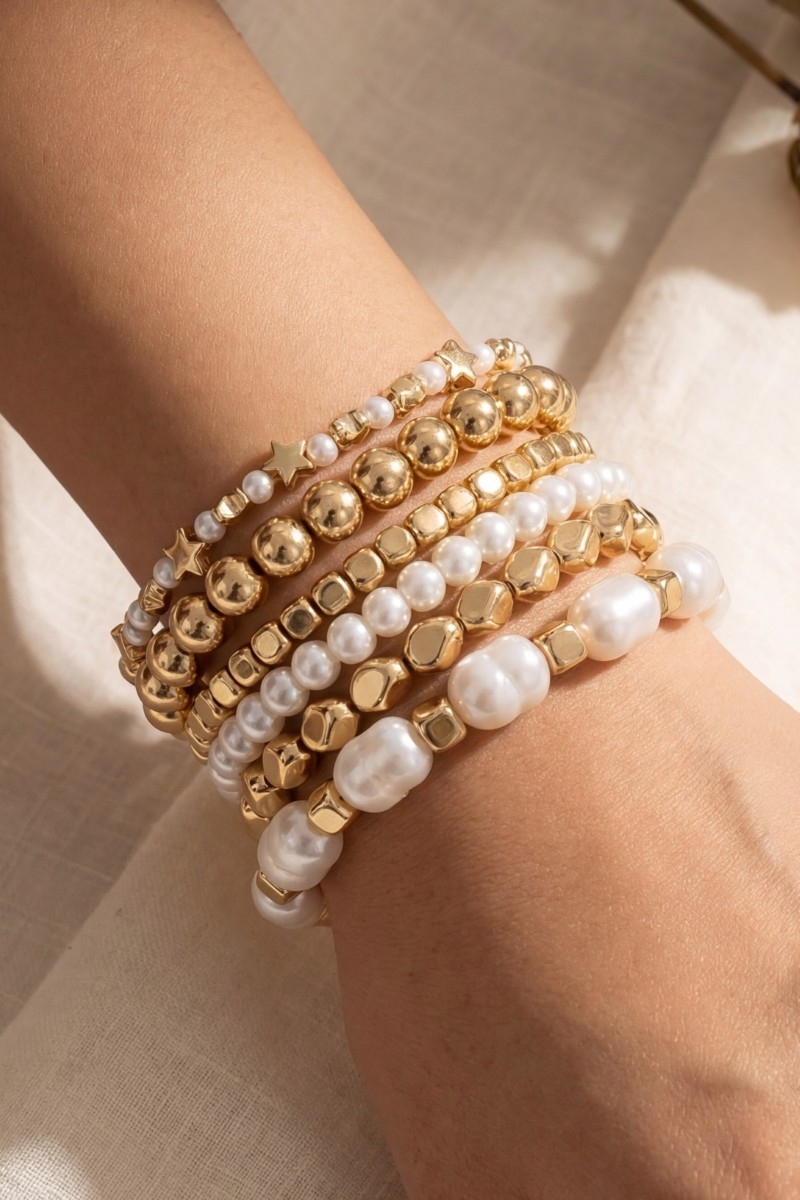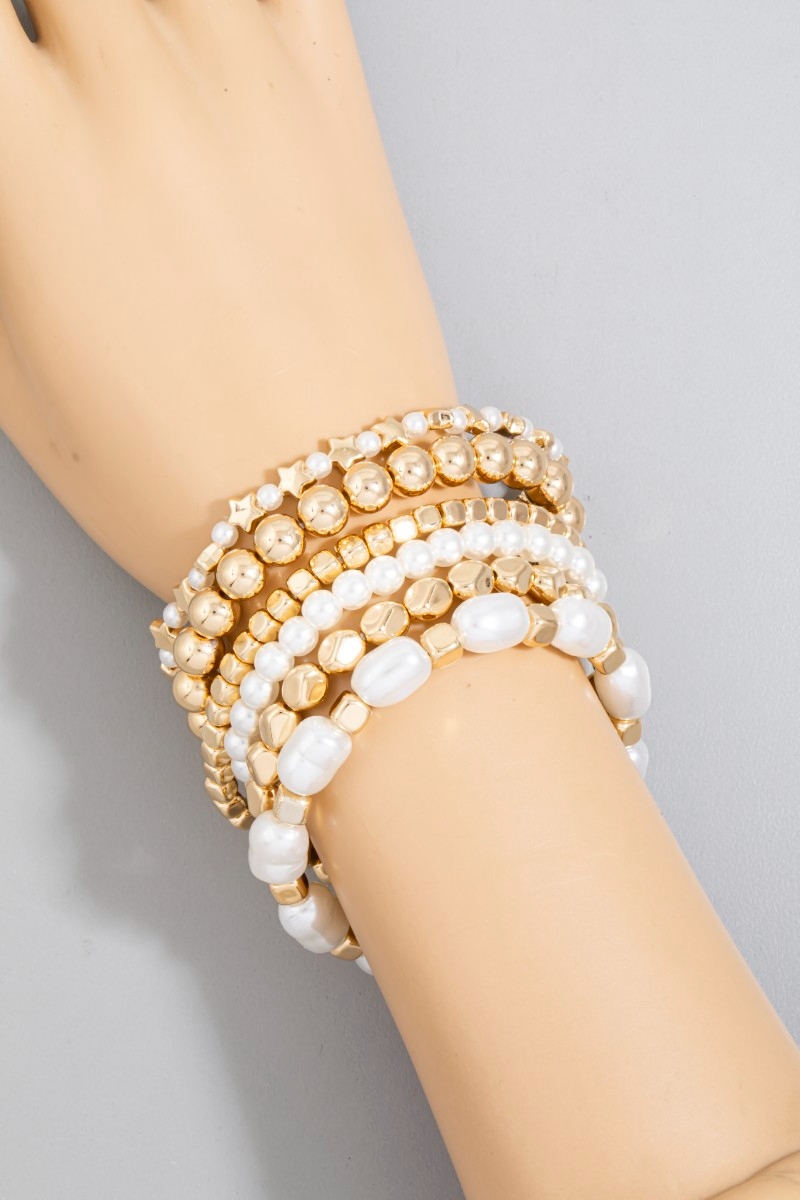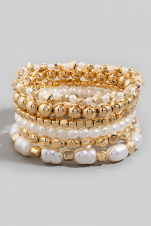 - This bracelet showcases a unique metallic and pearl beaded elastic set style. Discover the perfect balance of functionality and fashion.