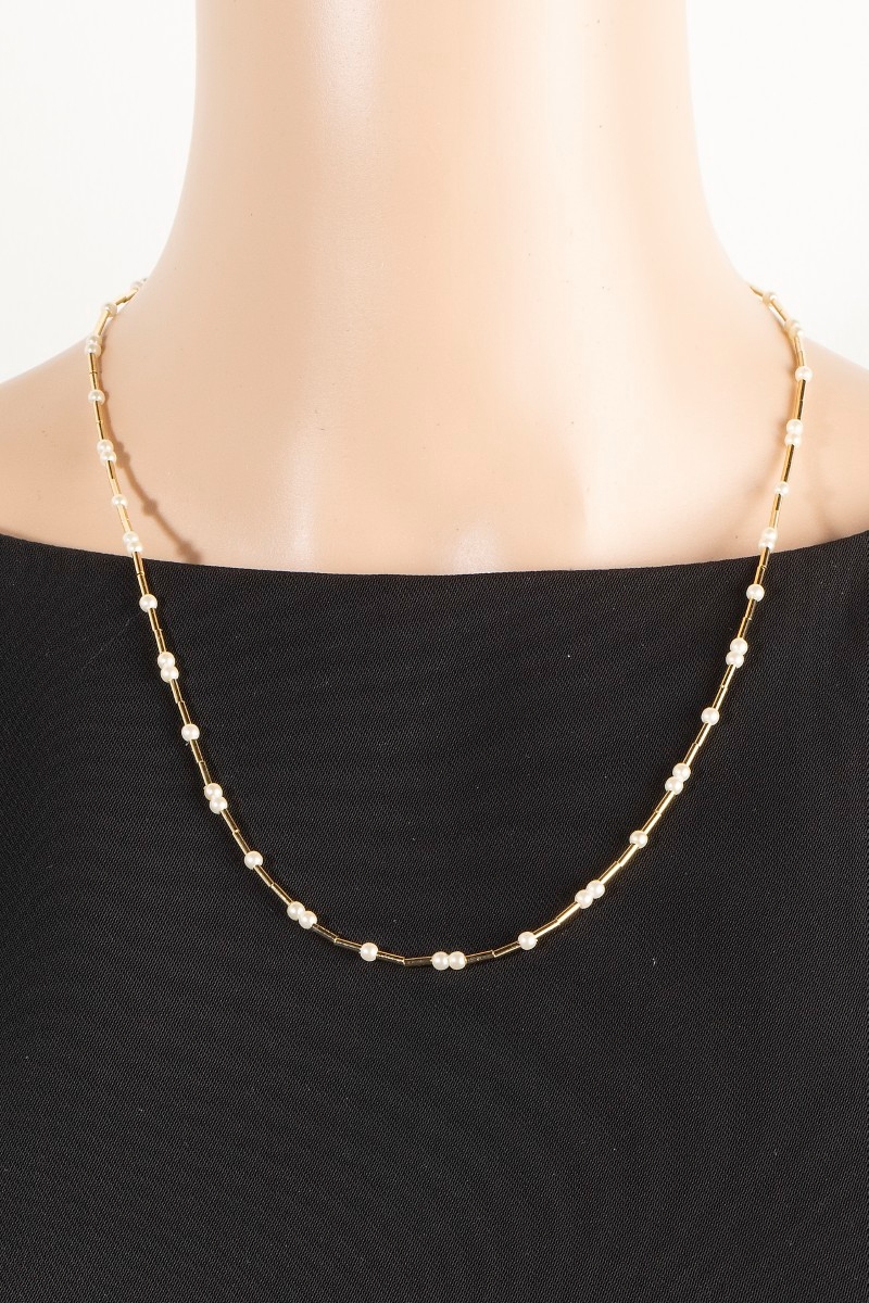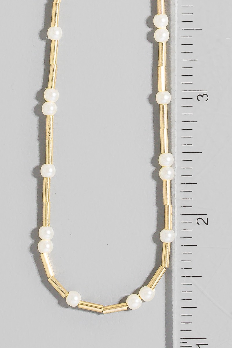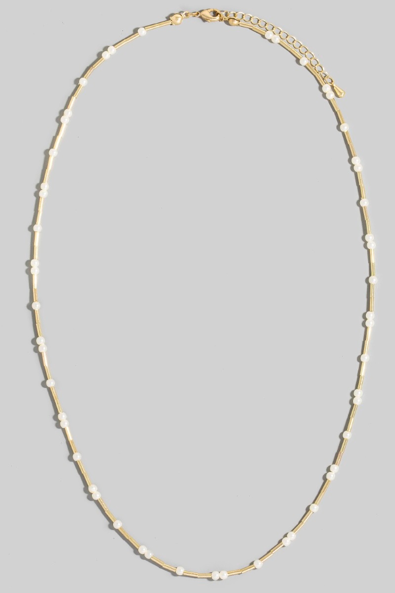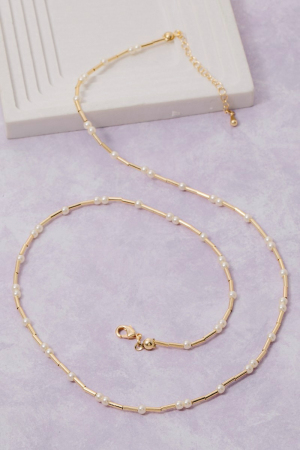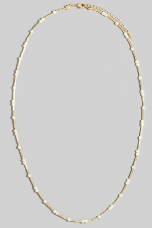 • This chain necklace introduces a stunning metallic tube and pearl beads style. Elevate your ensemble with this chic, timeless chain necklace.