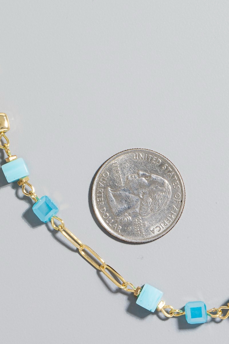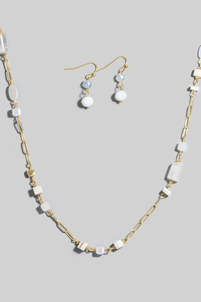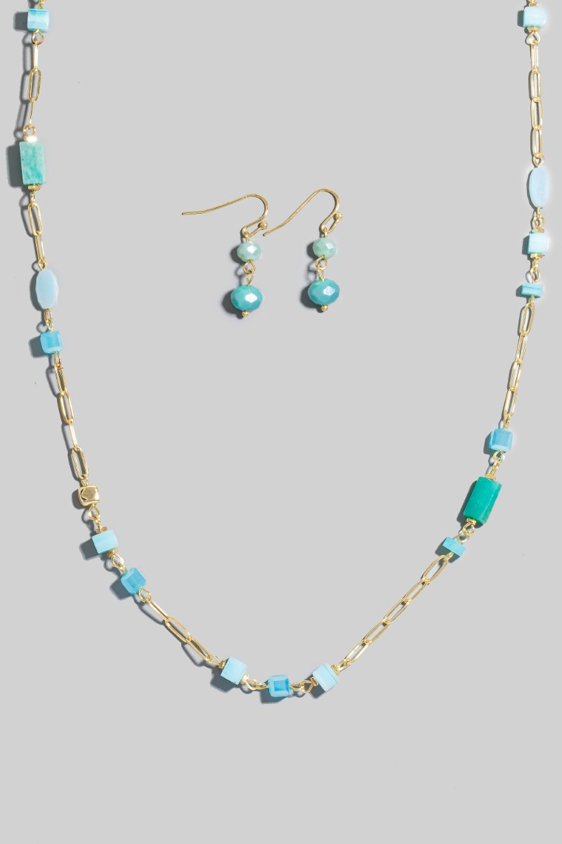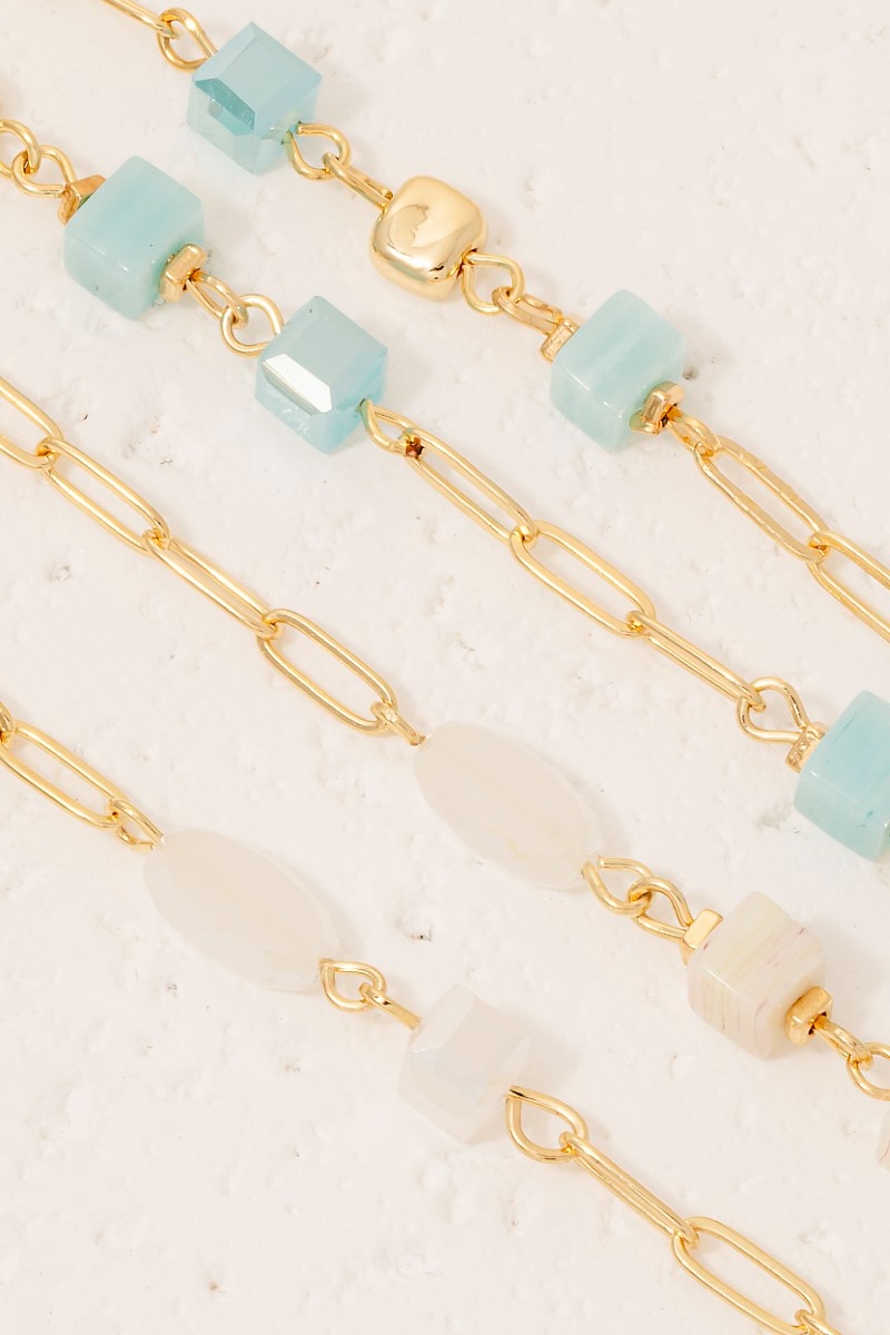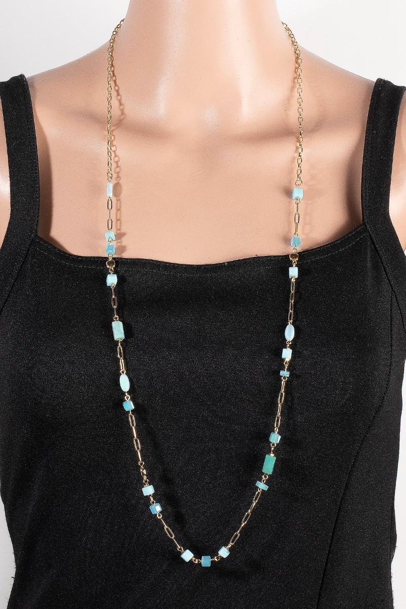 - This chain necklace showcases a unique mixed stone and metallic beaded long style. Experience a burst of creativity in accessorizing as this piece effortlessly sets the tone for your unique style.