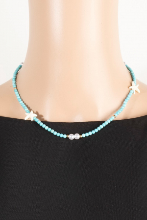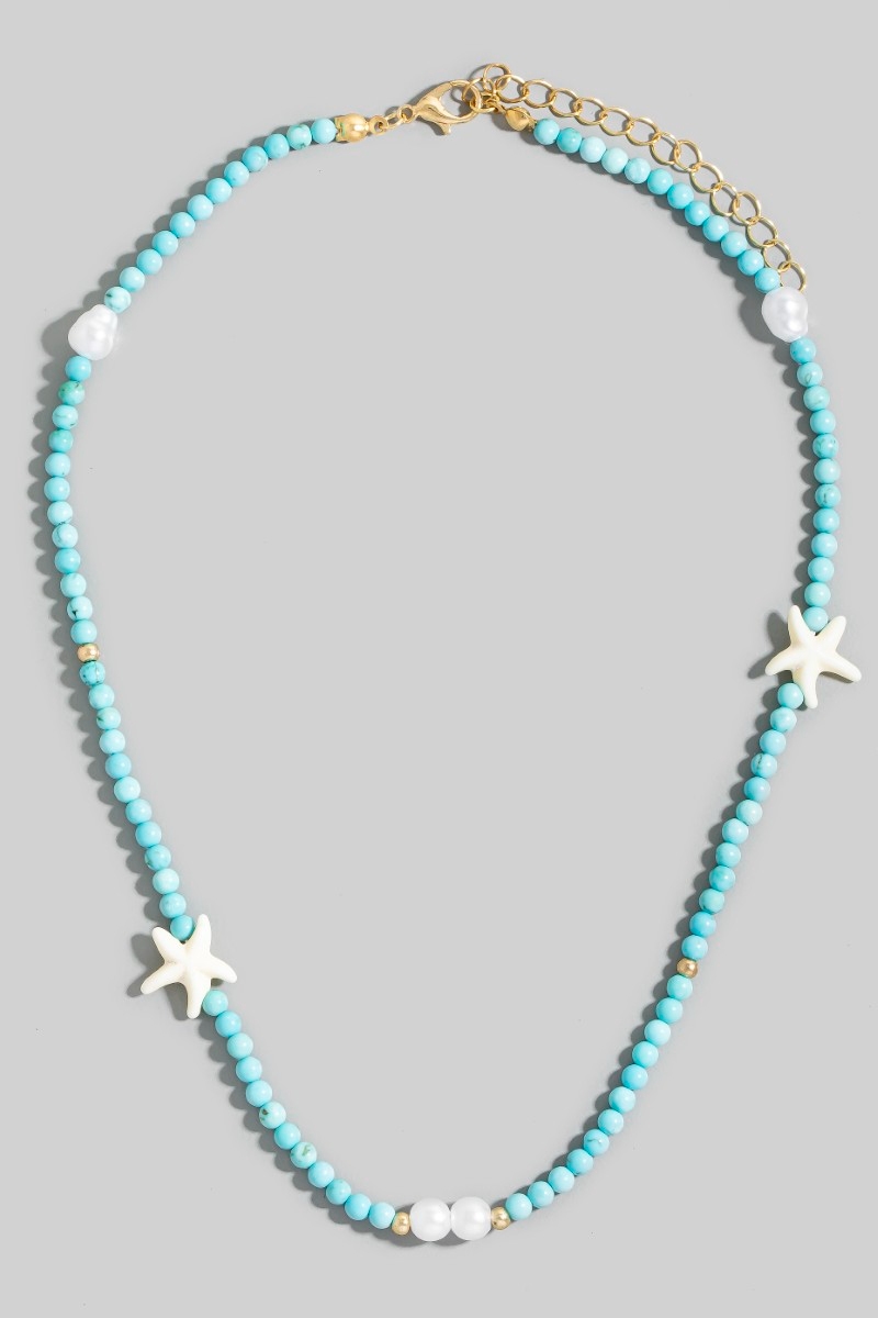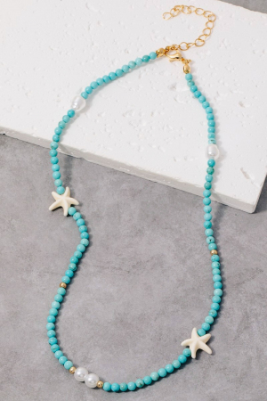 • This necklace displays a fashionable pearl and starfish turquoise beaded style. Indulge in the artistry of accessorizing with this unique piece.