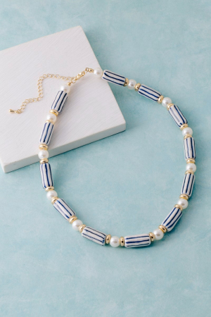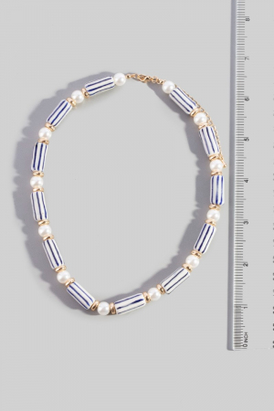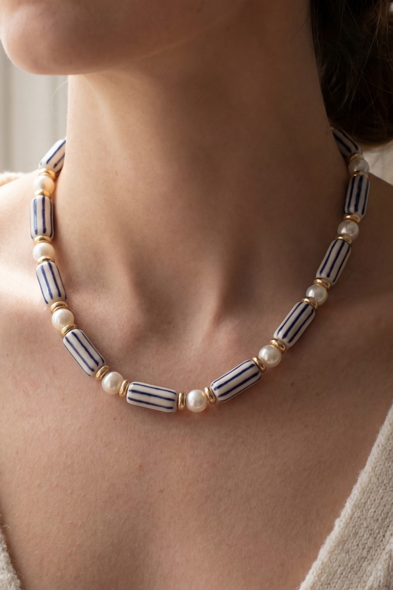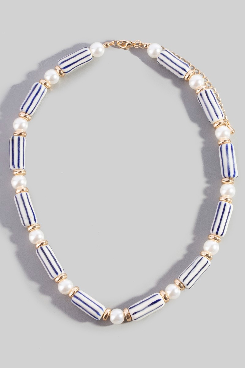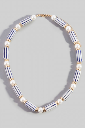 • This necklace brings a stunning pearl and striped ceramic beads style. Witness the transformative power of accessories as this piece effortlessly redefines your fashion narrative.