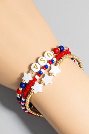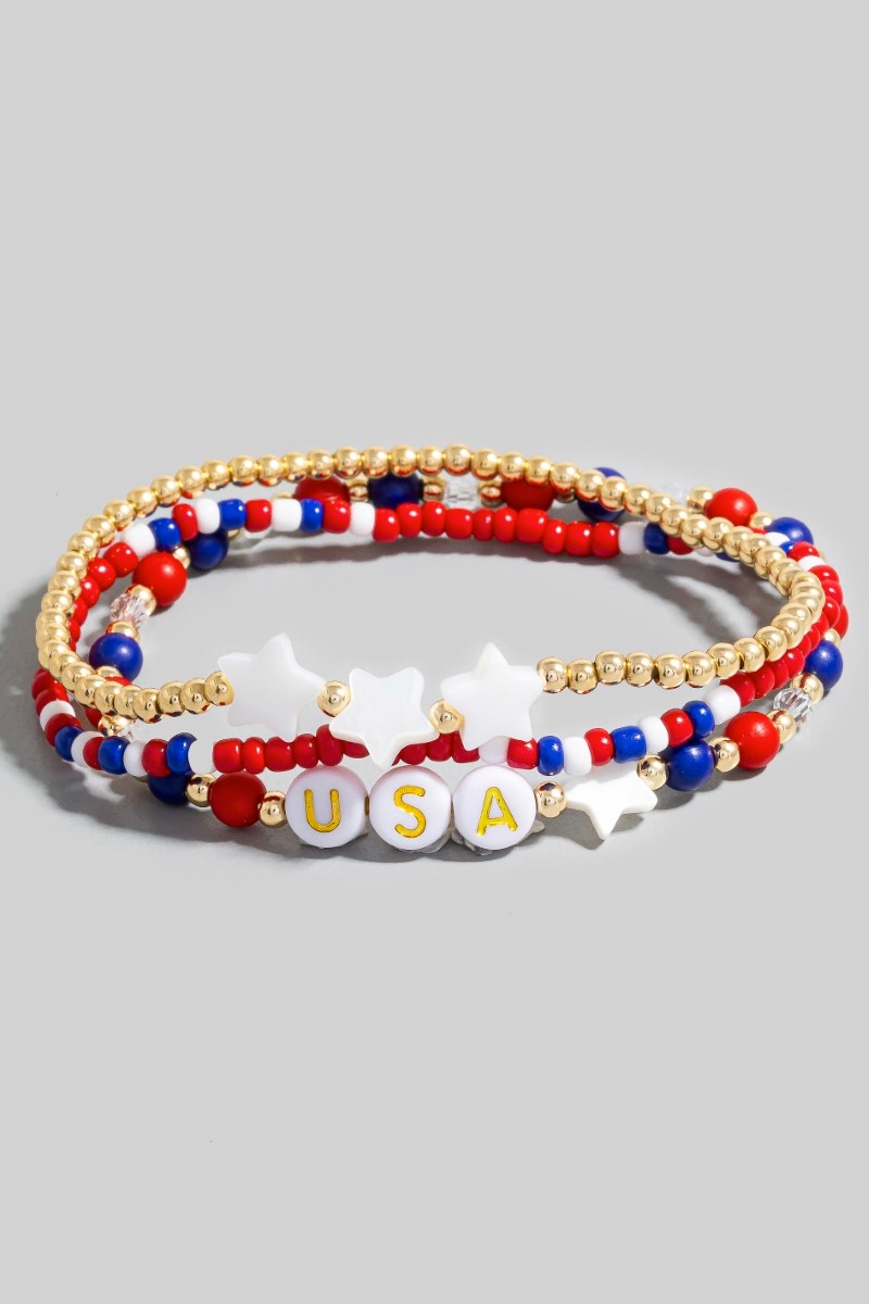 - This bracelet displays a fashionable usa colors and stars beaded set style. Indulge in the artistry of accessorizing with this unique piece.