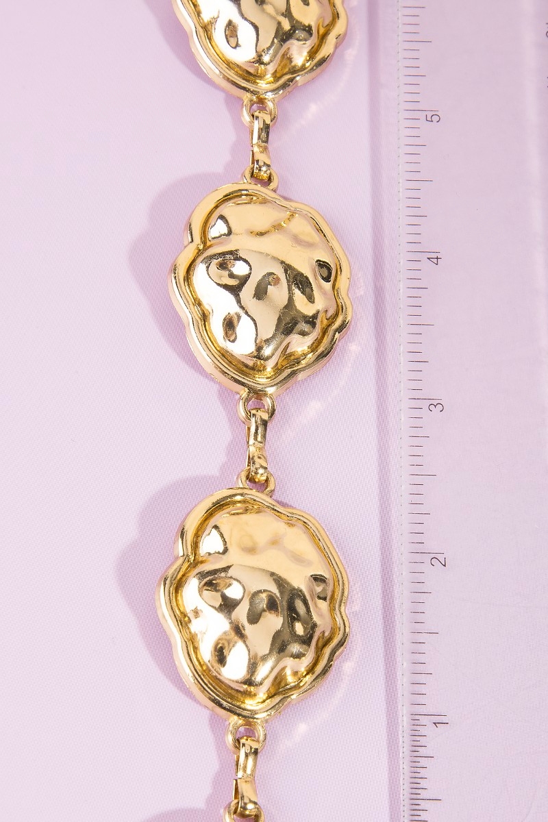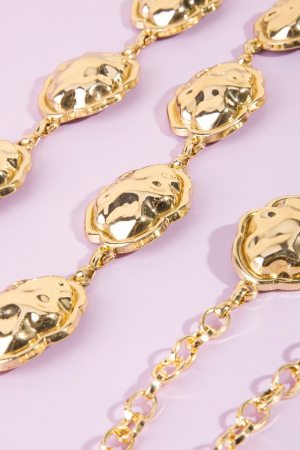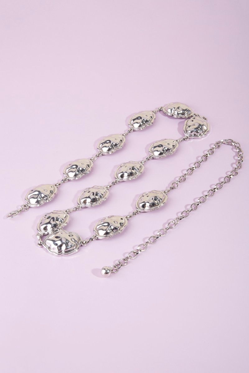 • This chain belt adds a modern abstract metallic oval style. Indulge in the allure of exquisite craftsmanship as this chain belt effortlessly adds a touch of luxury to your attire.