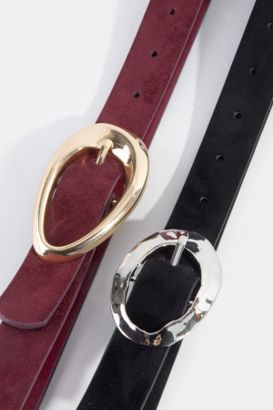 - This belt set displays a vibrant assorted two piece oval buckle vegan leather style. Elevate your ensemble with this belt set that effortlessly captures the essence of refined fashion.