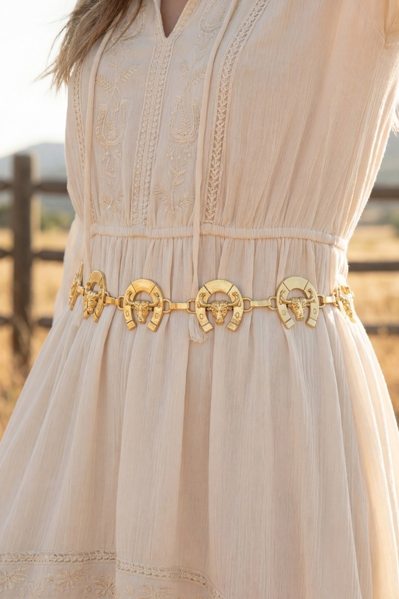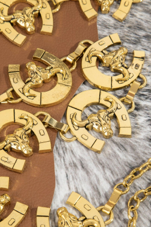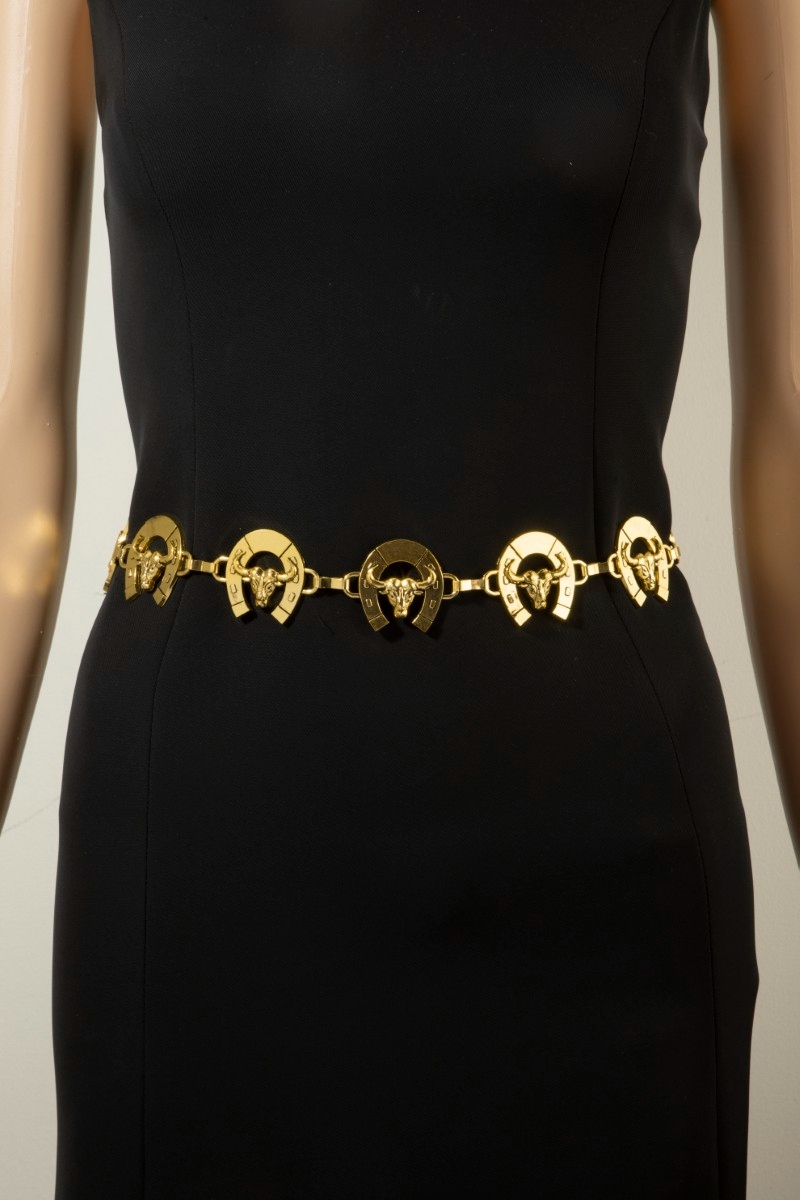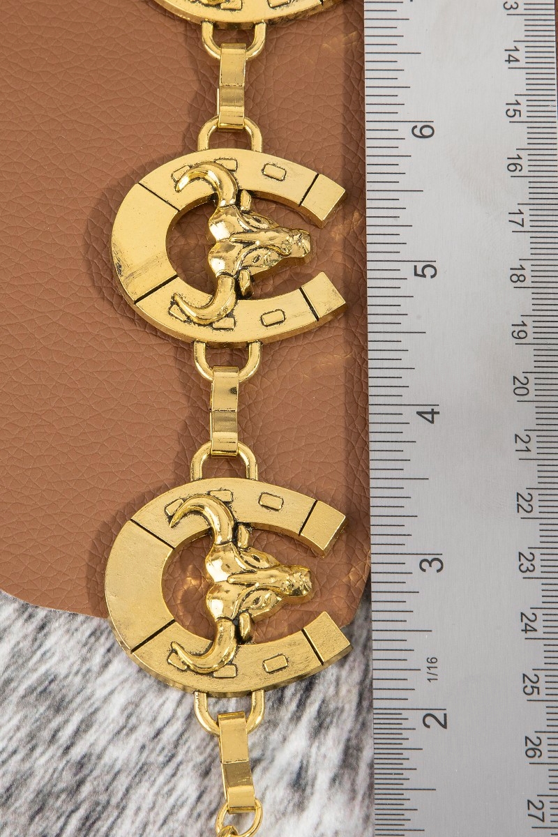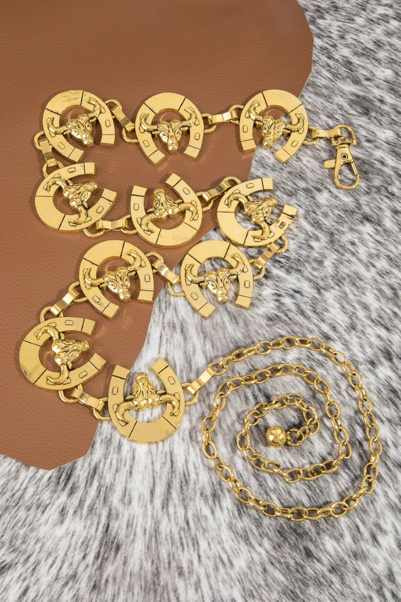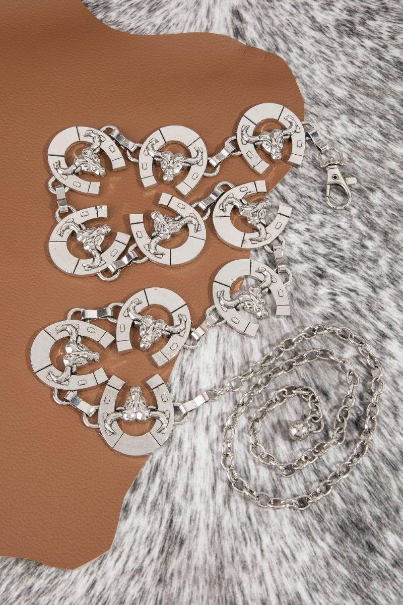 - This chain belt introduces a unique bull skull horseshoe link style. Revel in the intricate design that effortlessly distinguishes this chain belt, making it a statement piece.