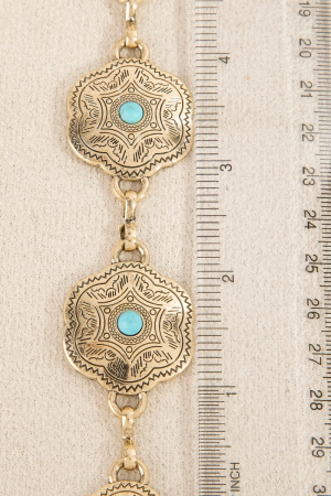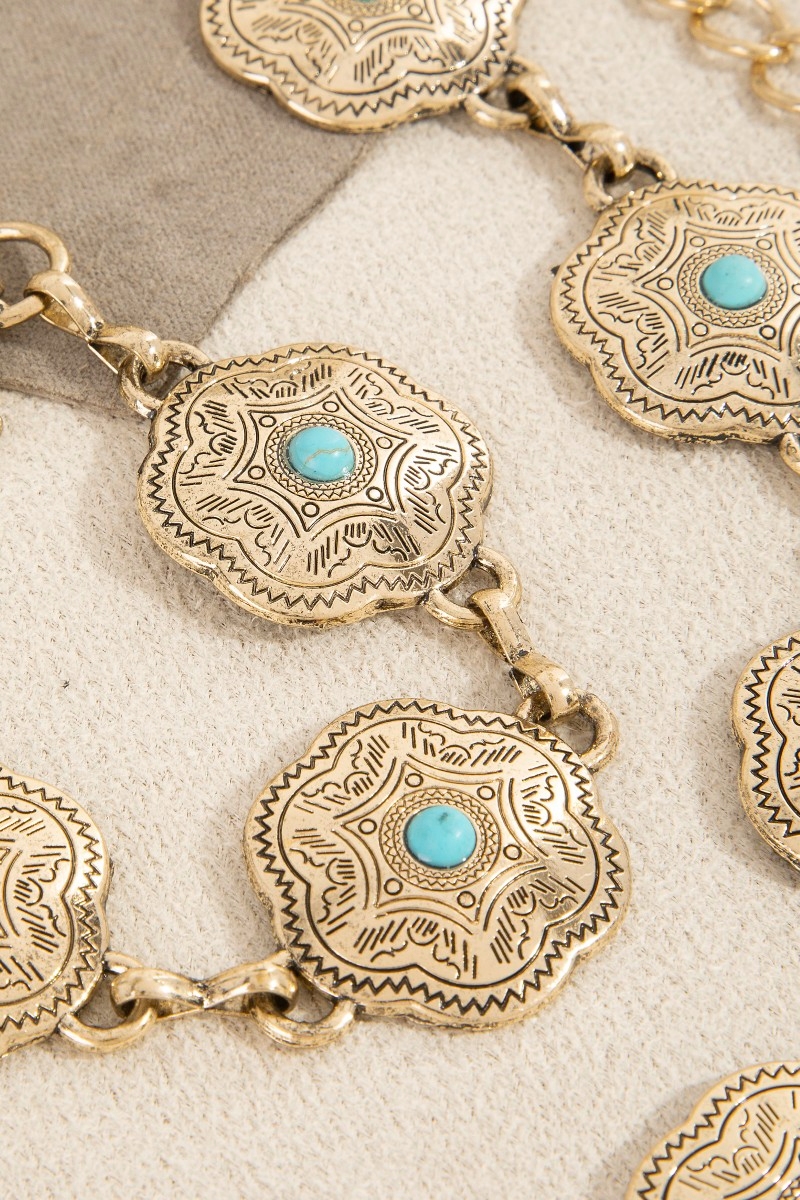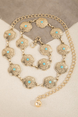 • This chain belt brings a unique floral disc western style. Immerse yourself in the world of understated glamour as this chain belt effortlessly exudes timeless appeal.
