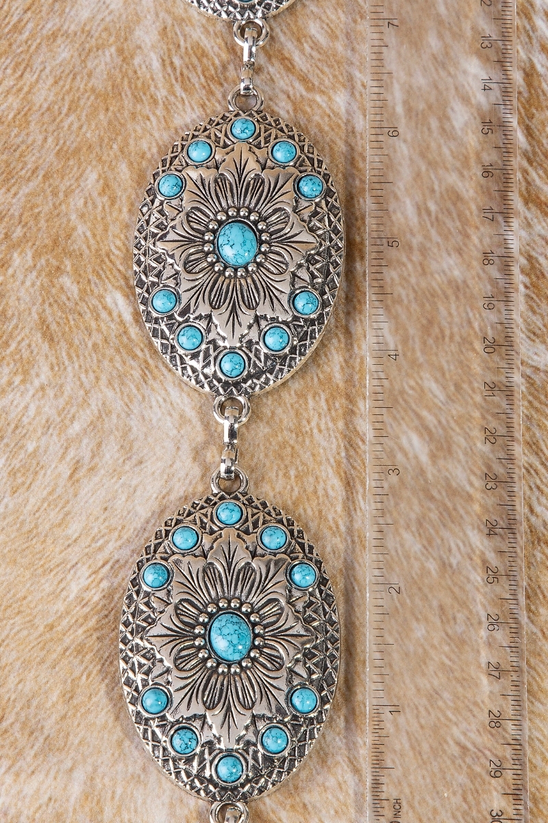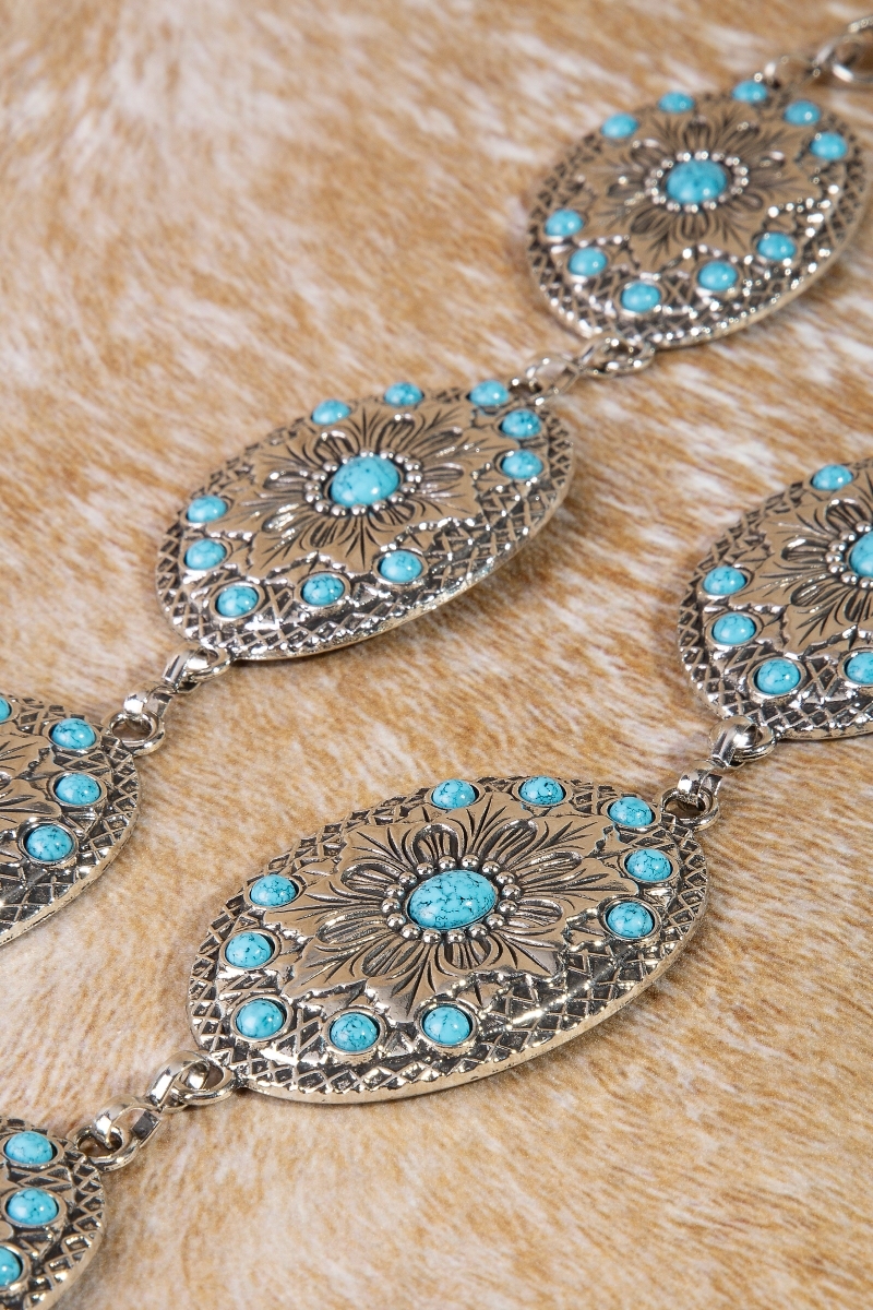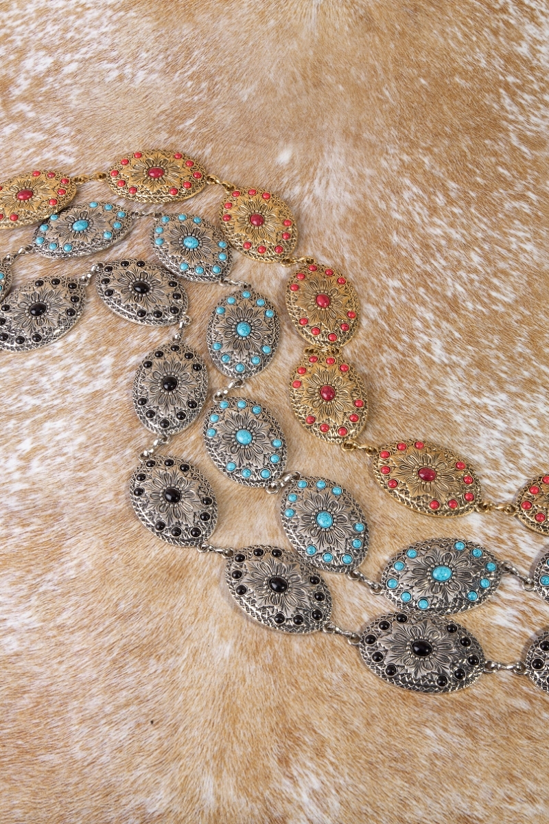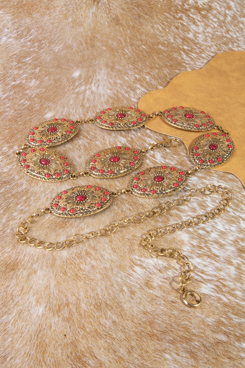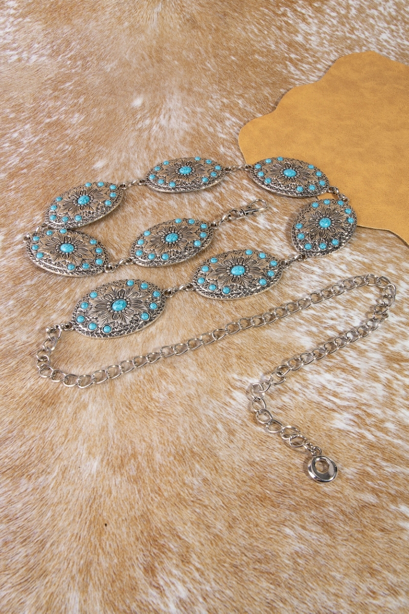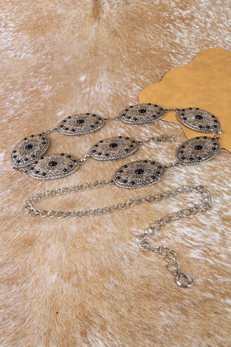 - This chain belt displays a fashionable intricate stone studs oval concho style. Step into a world of refined taste as this chain belt effortlessly refines the details of your outfit.