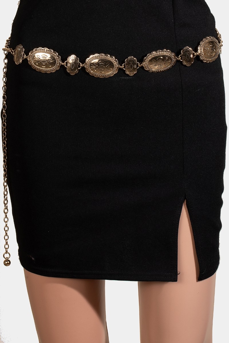 - This chain belt displays a vibrant metallic ornate oval style. Delight in the nuanced details that make this chain belt a testament to fine design and impeccable taste.