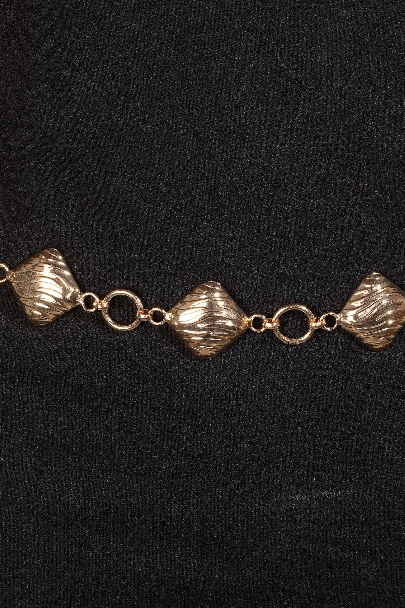 - This chain belt brings a stunning metallic textured square style. Revel in the intricate design that effortlessly distinguishes this chain belt, making it a statement piece.
