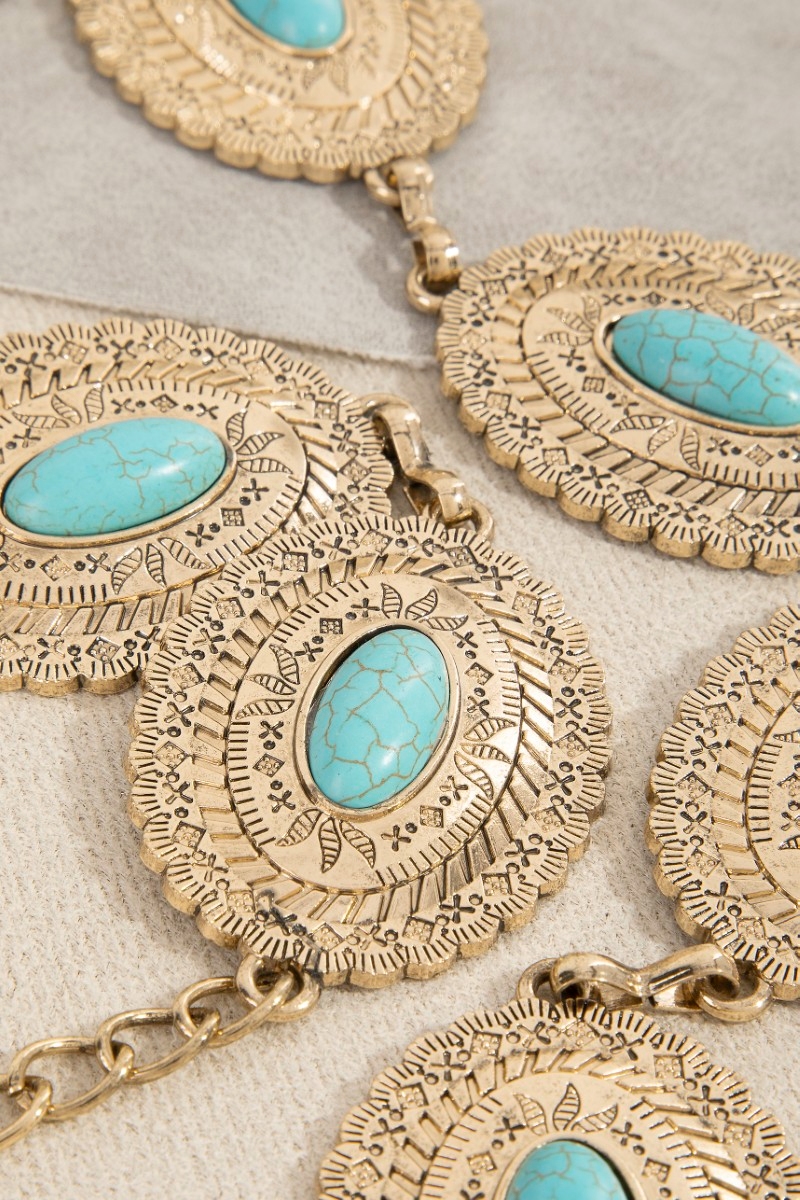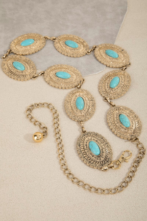 - This chain belt brings a stunning oval turquoise concho disc style. Immerse yourself in fashion finesse with this statement chain belt.
