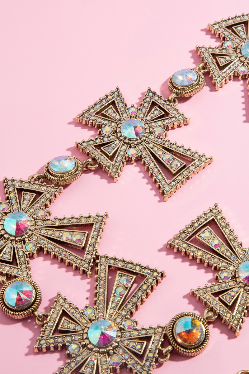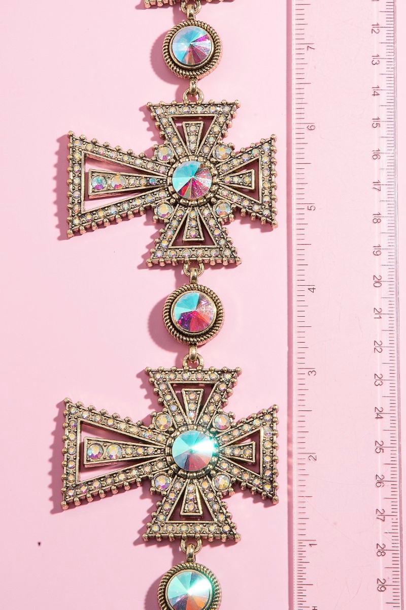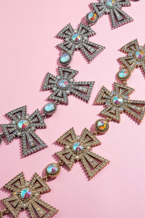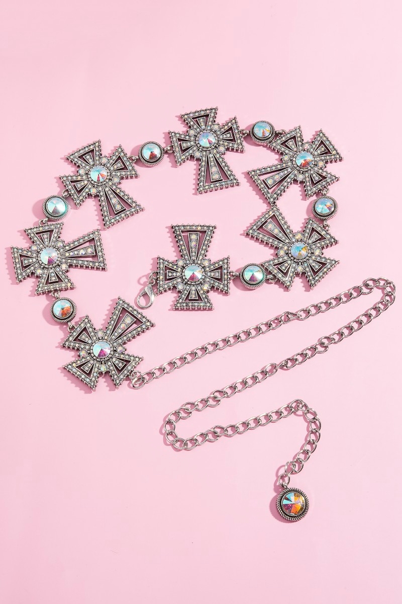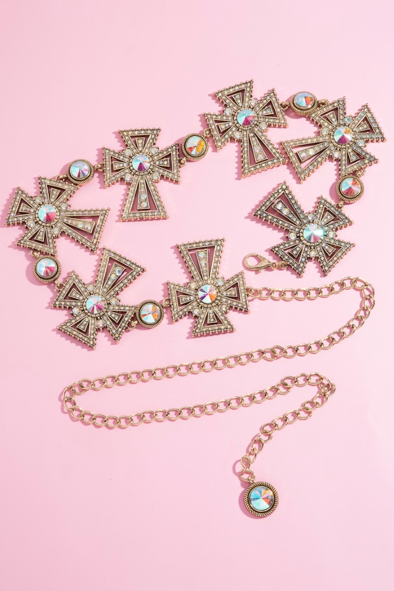 • This chain belt showcases a unique pave crystal cross style. Delight in the nuanced details that make this chain belt a testament to fine design and impeccable taste.