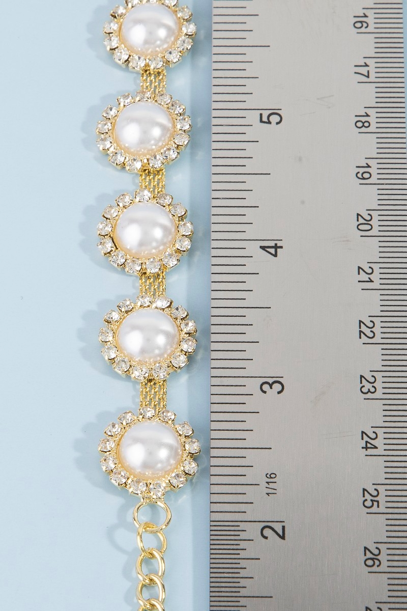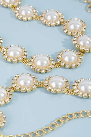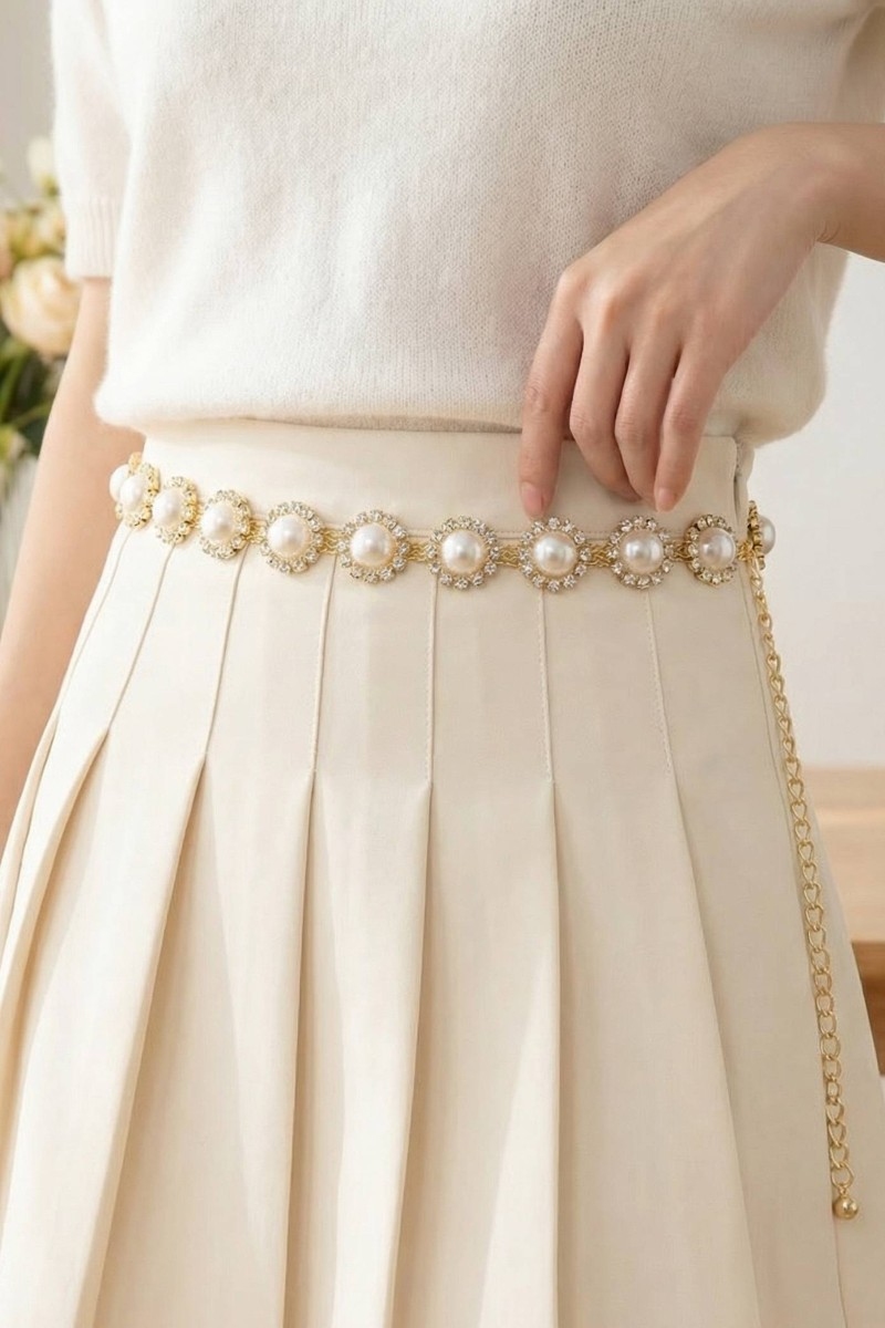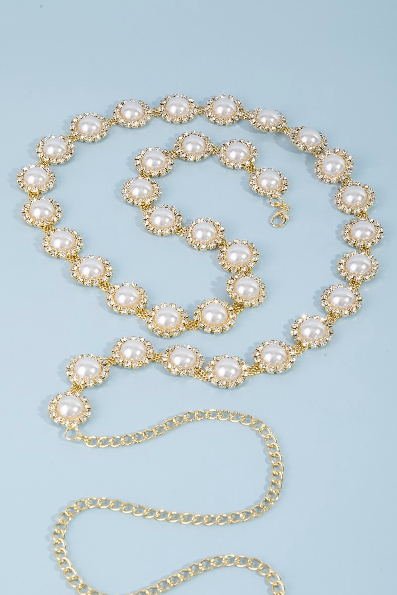 - This chain belt displays a vibrant pearl and rhinestone disc style. Elevate your ensemble with this chic, timeless accessory.