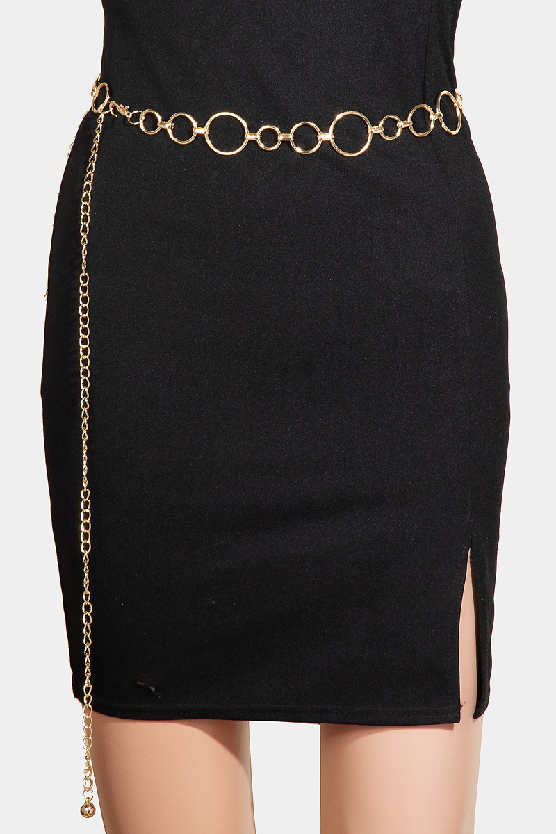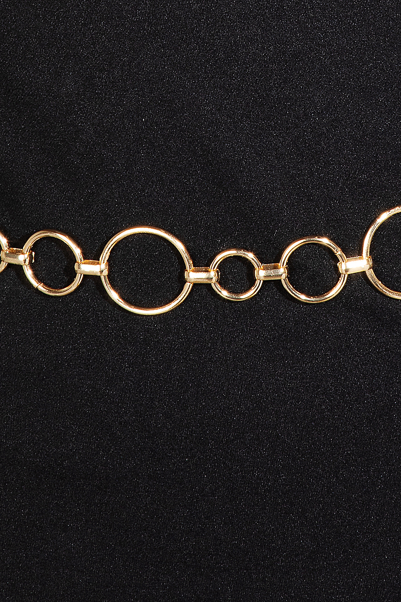 - This chain belt showcases a unique simple metallic hoop style. Experience a subtle blend of modernity and classic charm as this chain belt effortlessly adorns your ensemble.