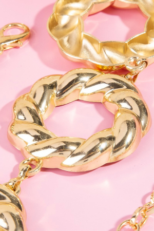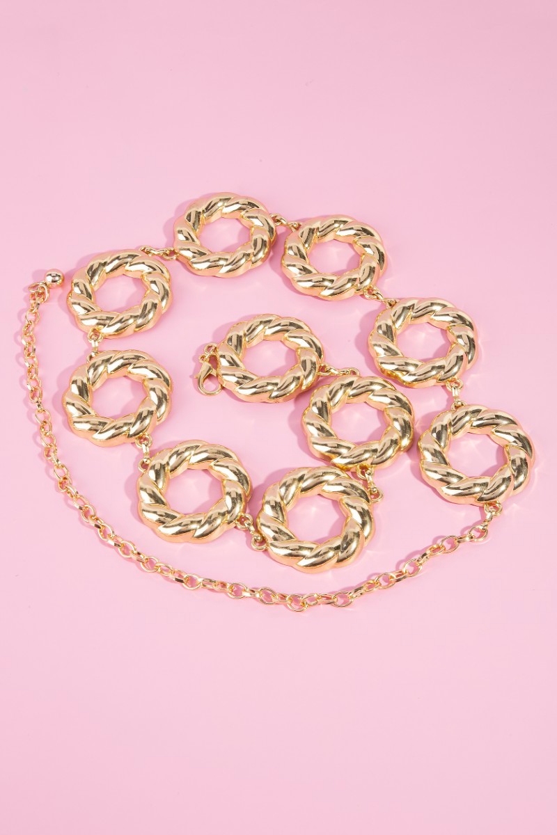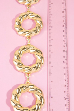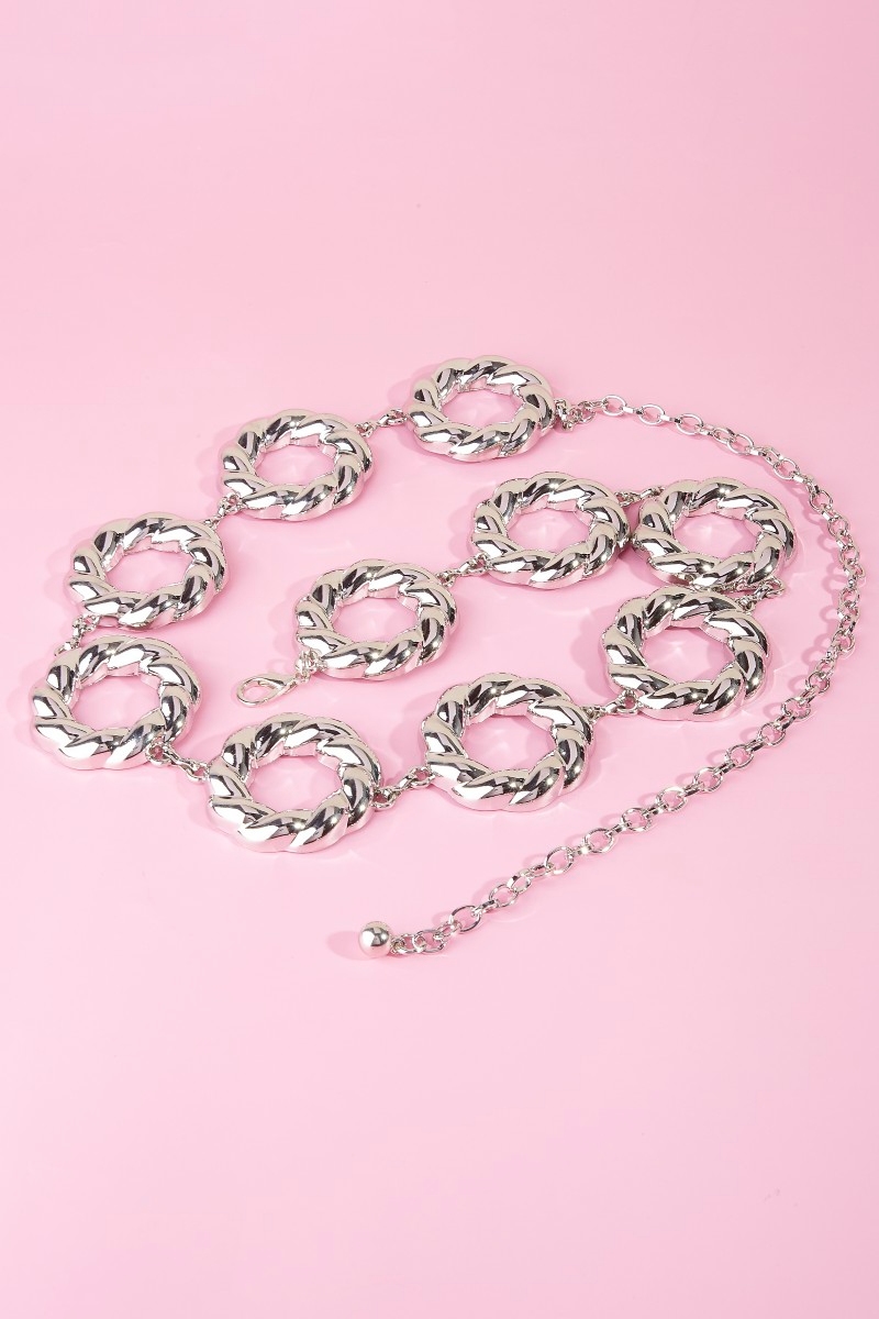• This chain belt features a fashionable thick metallic twisted hoop style. Experience a subtle blend of modernity and classic charm as this chain belt effortlessly adorns your ensemble.