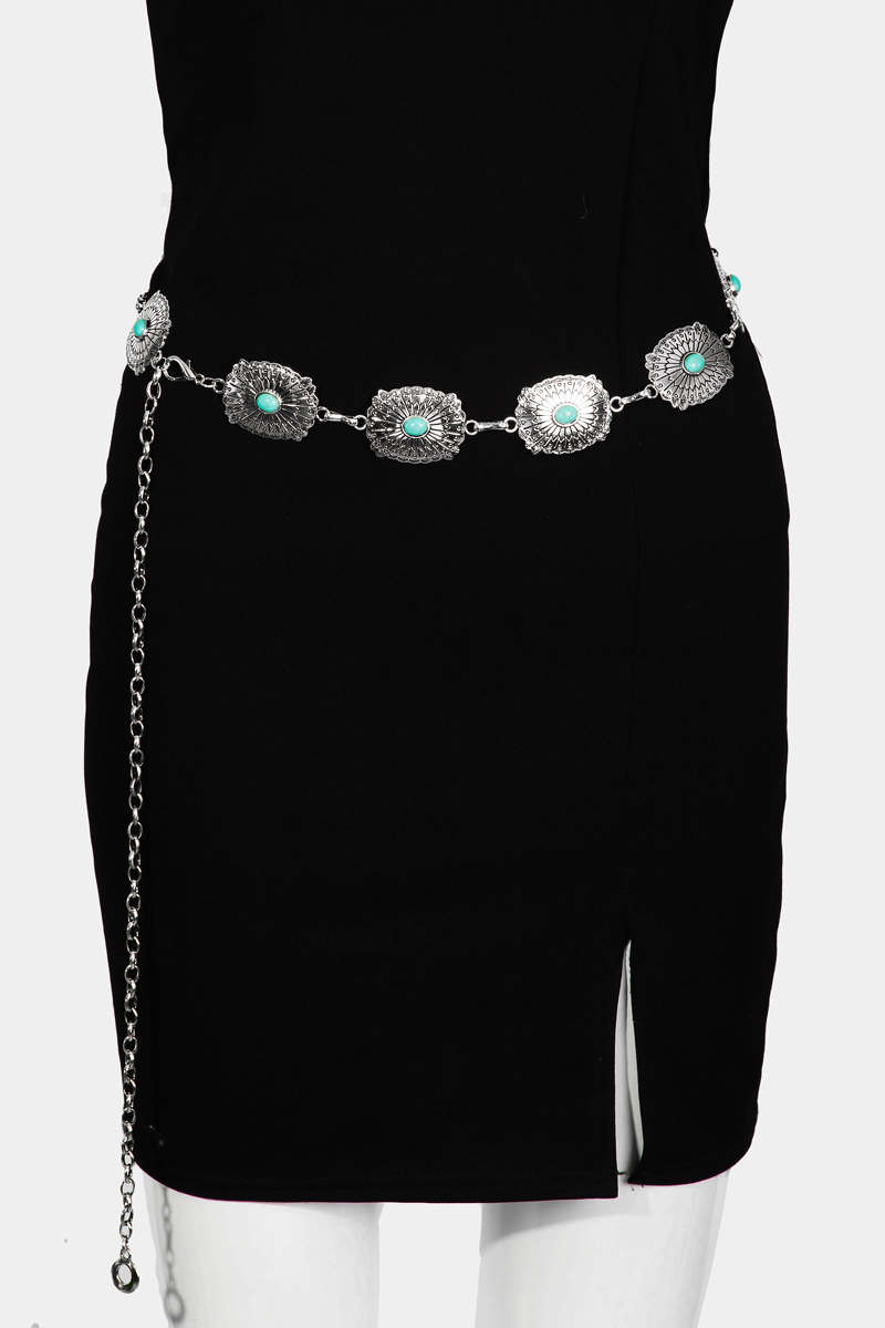 • This chain belt displays a vibrant turqoise studded oval style. Immerse yourself in the world of understated glamour as this chain belt effortlessly exudes timeless appeal.