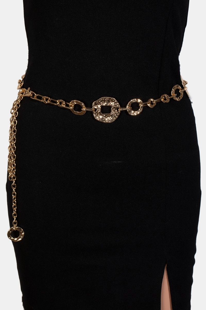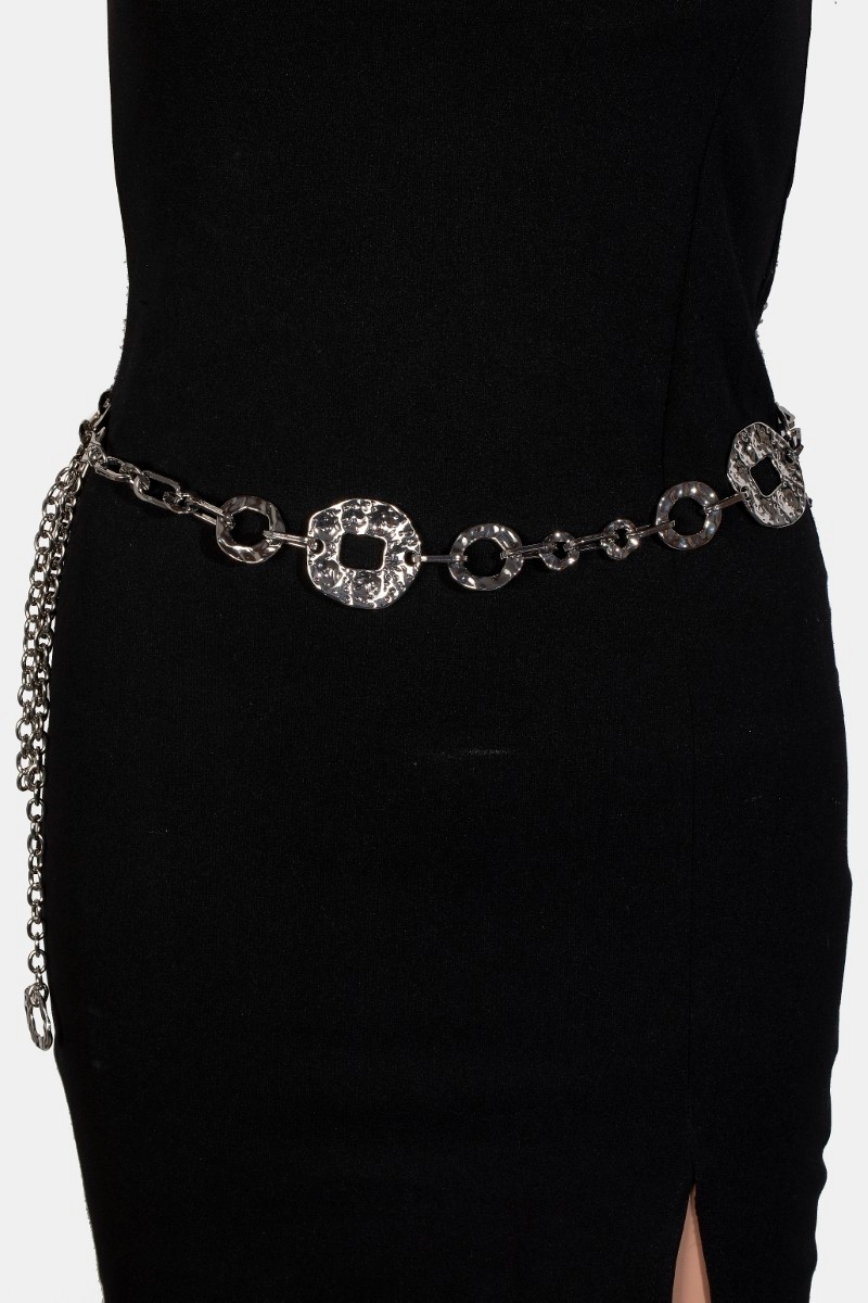 - This chain belt introduces a stunning warped metallic flat style. Redefine your look effortlessly with this standout, on-trend piece.