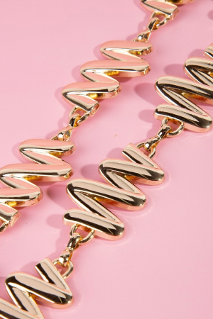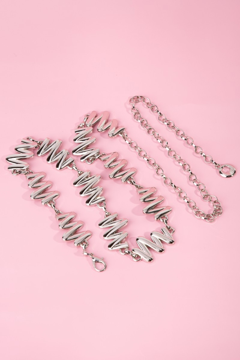 • This chain belt brings a luxurious wavy metallic zigzag style. Step into a world of refined taste as this chain belt effortlessly refines the details of your outfit.