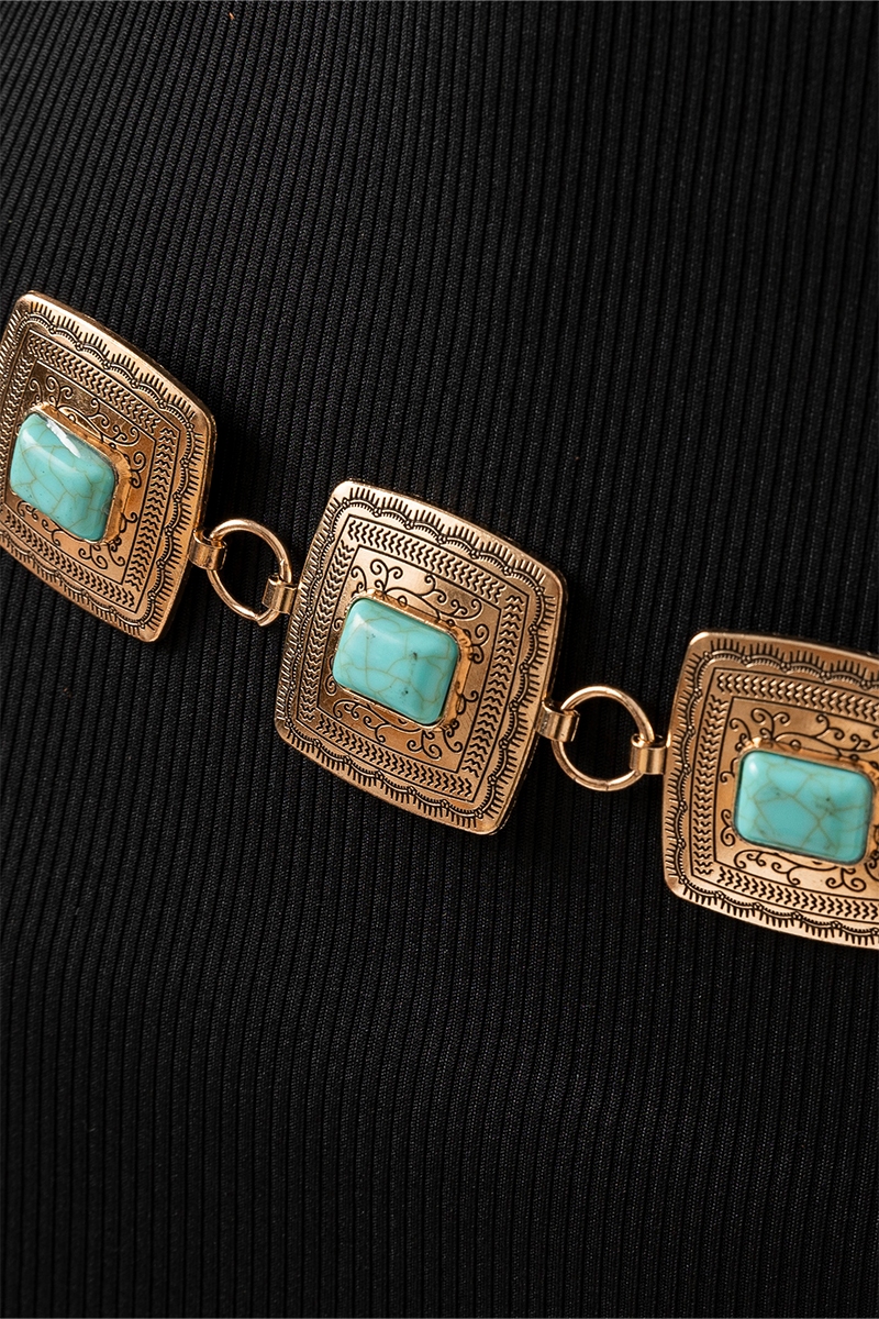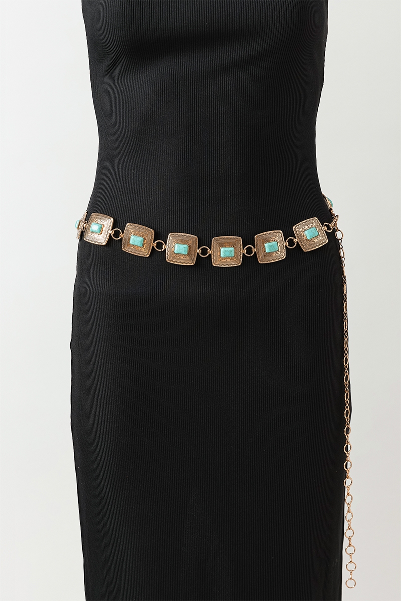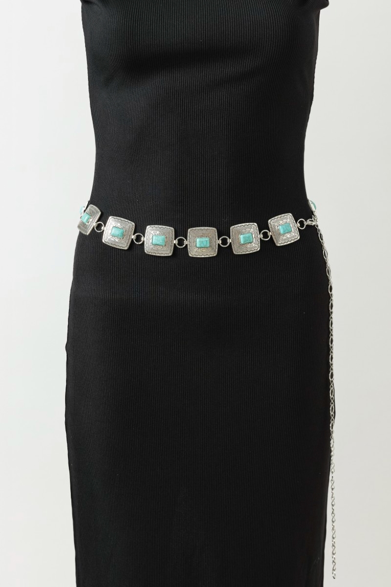 • This chain belt showcases a timeless western concho turquoise square style. Discover the perfect balance of subtlety and flair as this chain belt effortlessly completes your look.