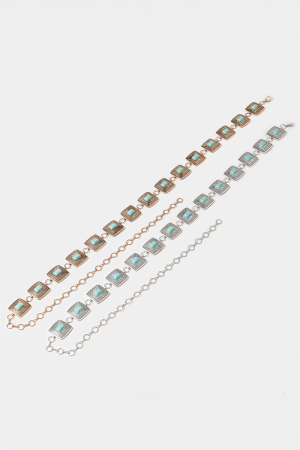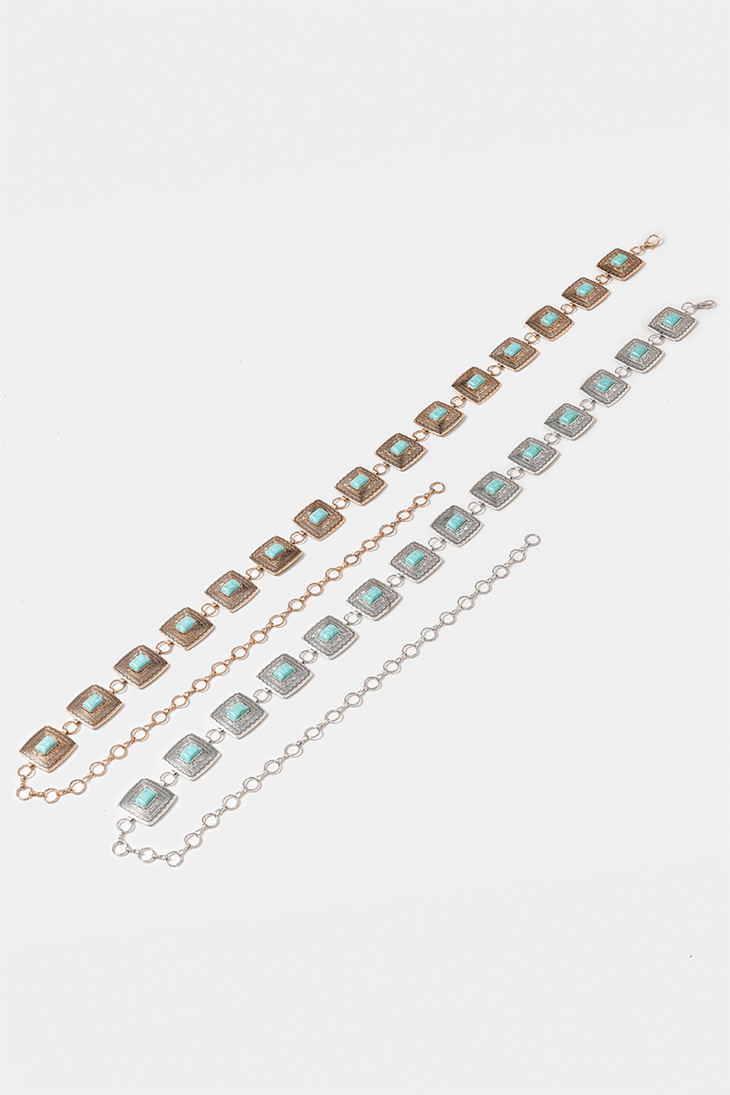 - This chain belt showcases a timeless western concho turquoise square style. Discover the perfect balance of subtlety and flair as this chain belt effortlessly completes your look.