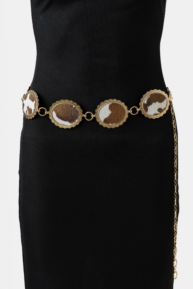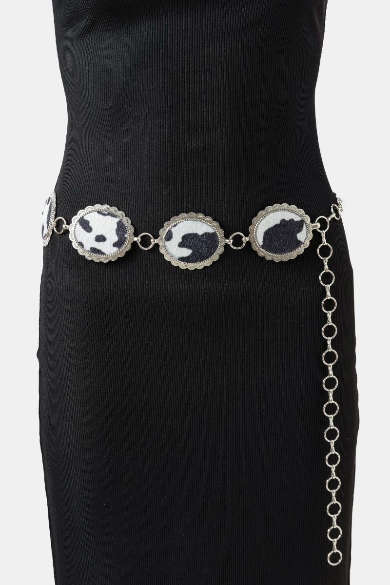 • This chain belt displays a vibrant western cowhide disc style. Immerse yourself in fashion finesse with this statement chain belt.
