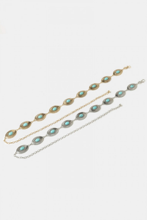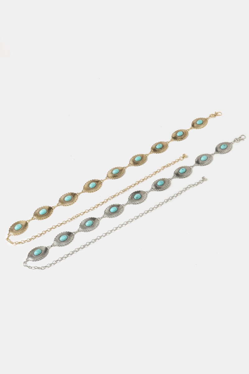 • This chain belt introduces a unique western floral turquoise concho disc style. Experience refined sophistication with this understated yet stylish piece.