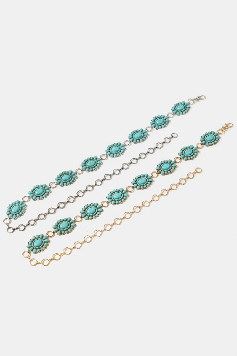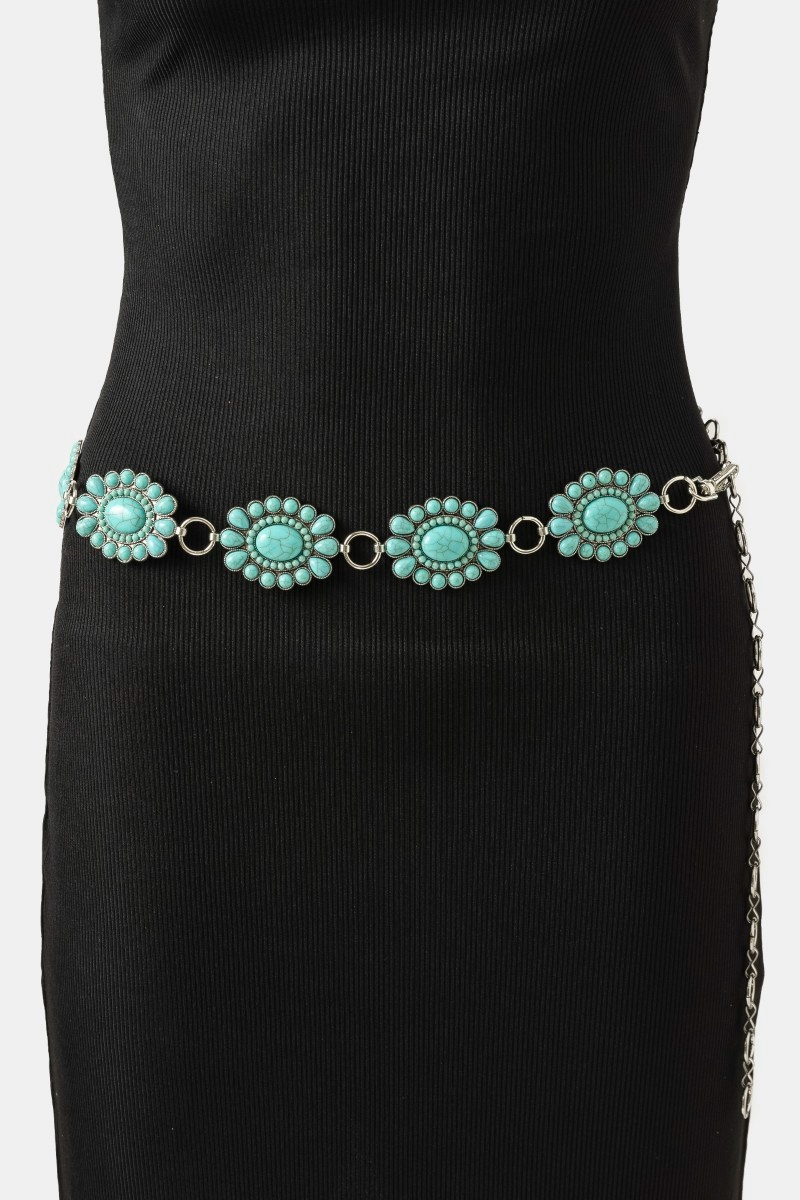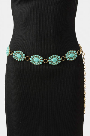 • This chain belt introduces a stunning western turquoise stone bead concho disc style. Savor the craftsmanship that goes beyond the ordinary, as this chain belt effortlessly captivates attention.