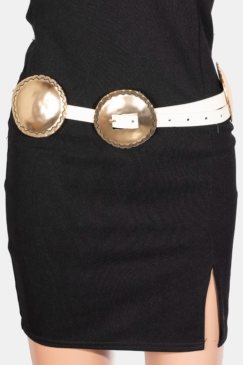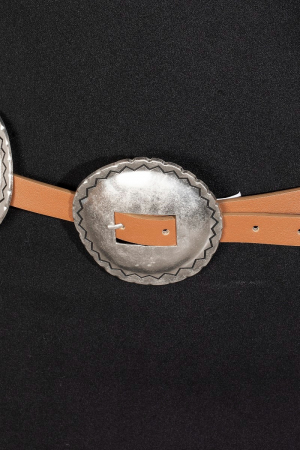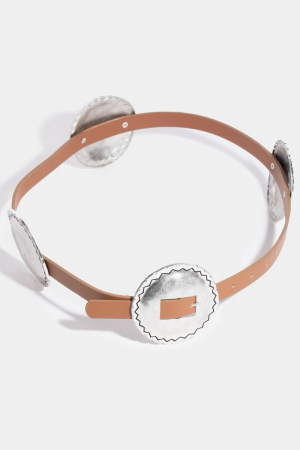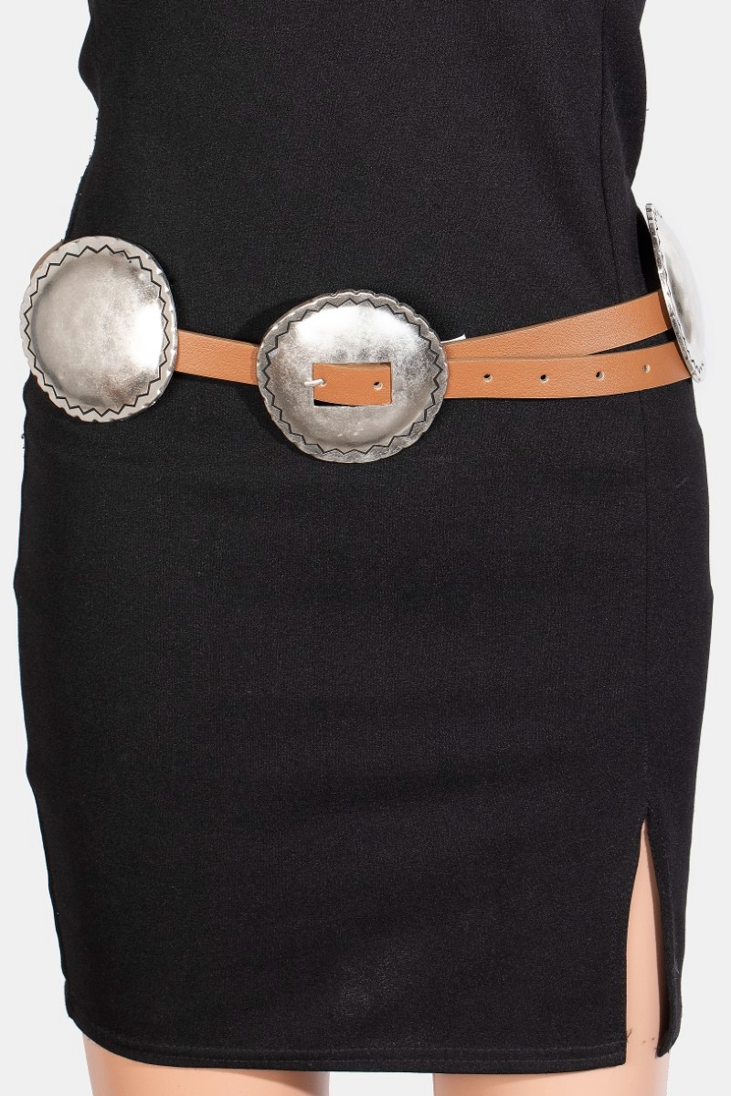 • This faux leather belt introduces a unique large concho discs style. Elevate your ensemble with this chic, timeless faux leather belt.