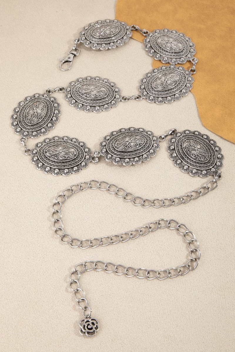 - This chain belt showcases a timeless oval western concho chain link belt style. Elevate your ensemble with this chic, timeless chain belt.
