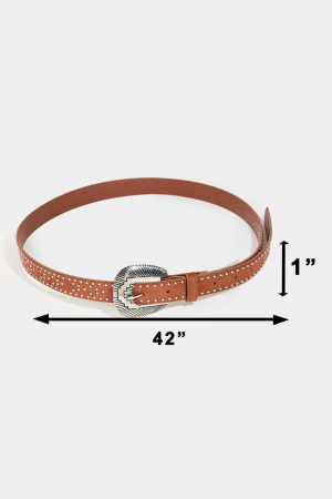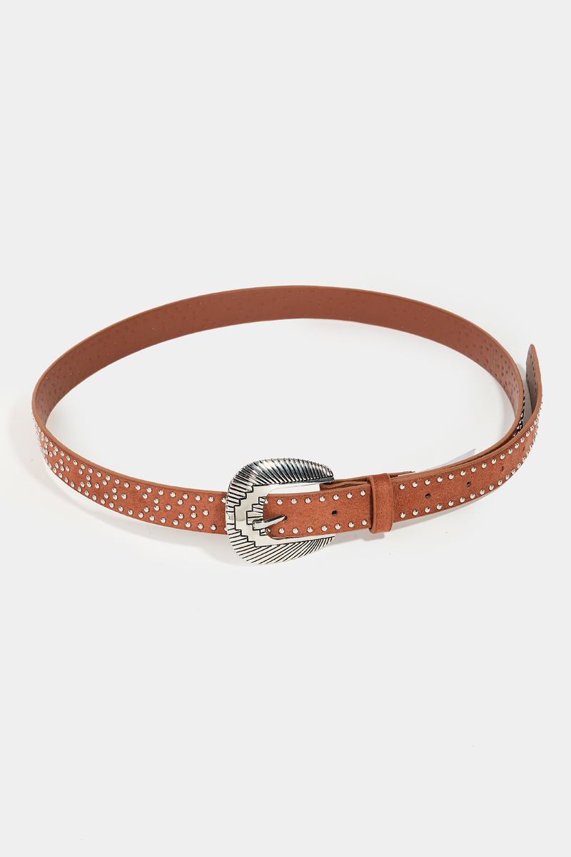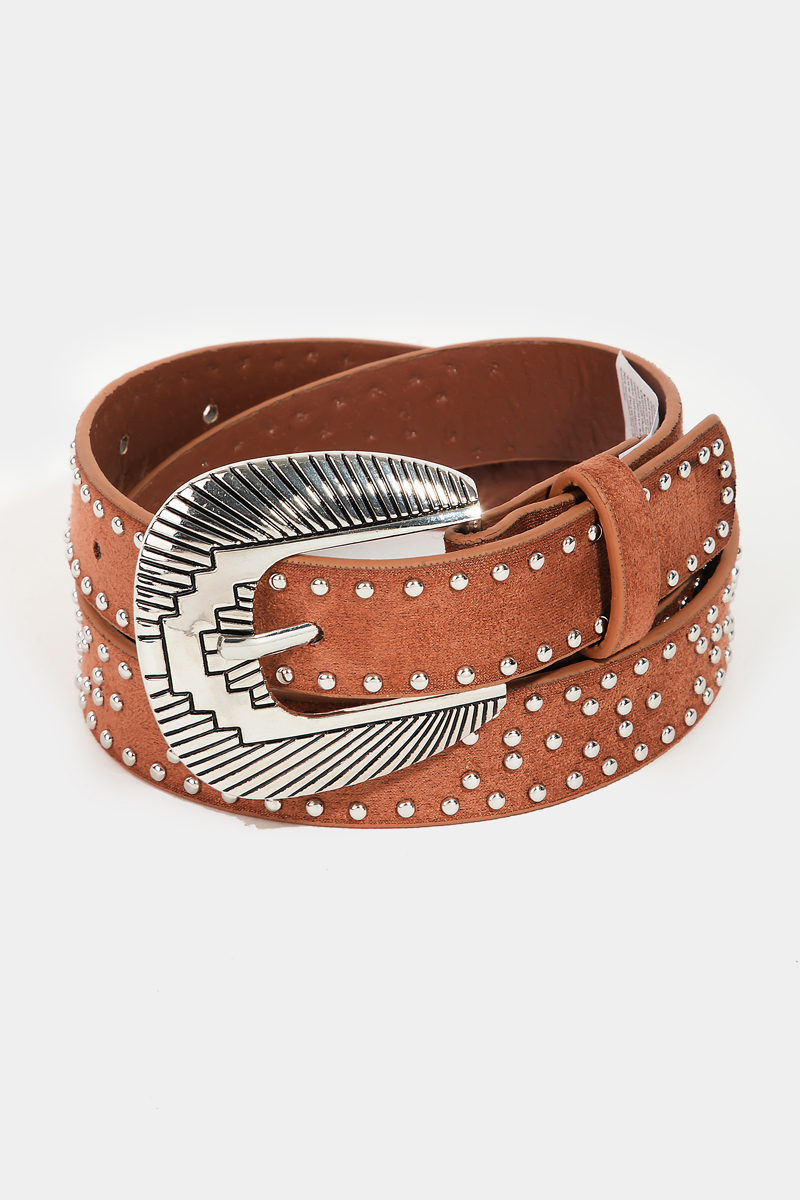 - This faux leather belt adds a modern studded western style. Celebrate the art of accessorizing with this piece that effortlessly encapsulates modern trends.