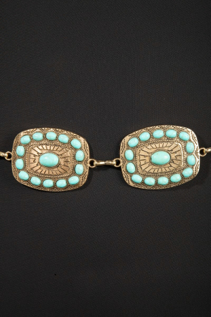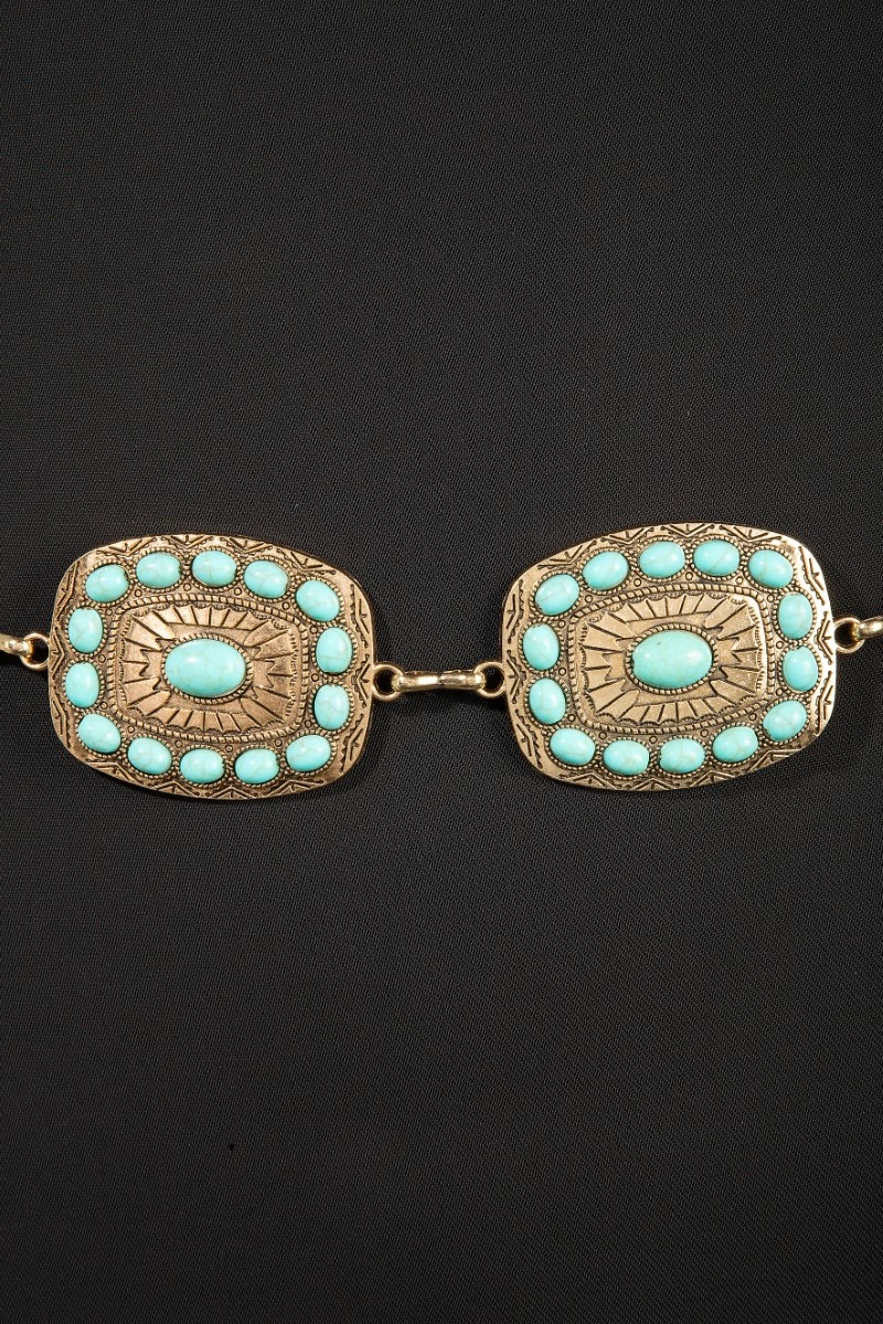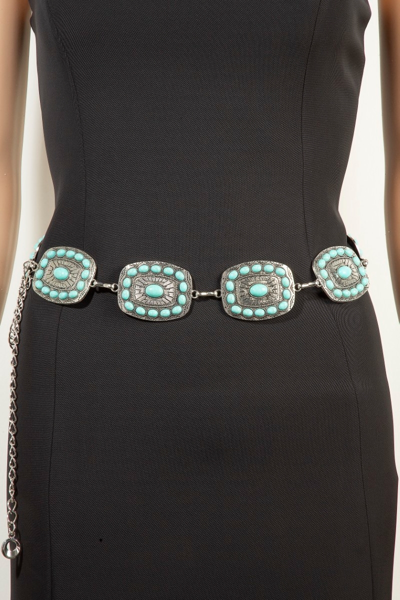 • This chain belt brings a stunning western turquoise round studded rectangle concho style. Experience a burst of creativity in accessorizing as this piece effortlessly sets the tone for your unique style.