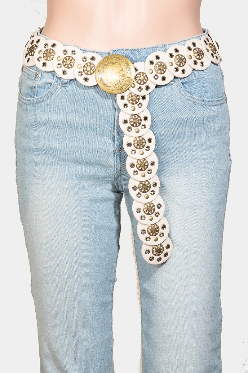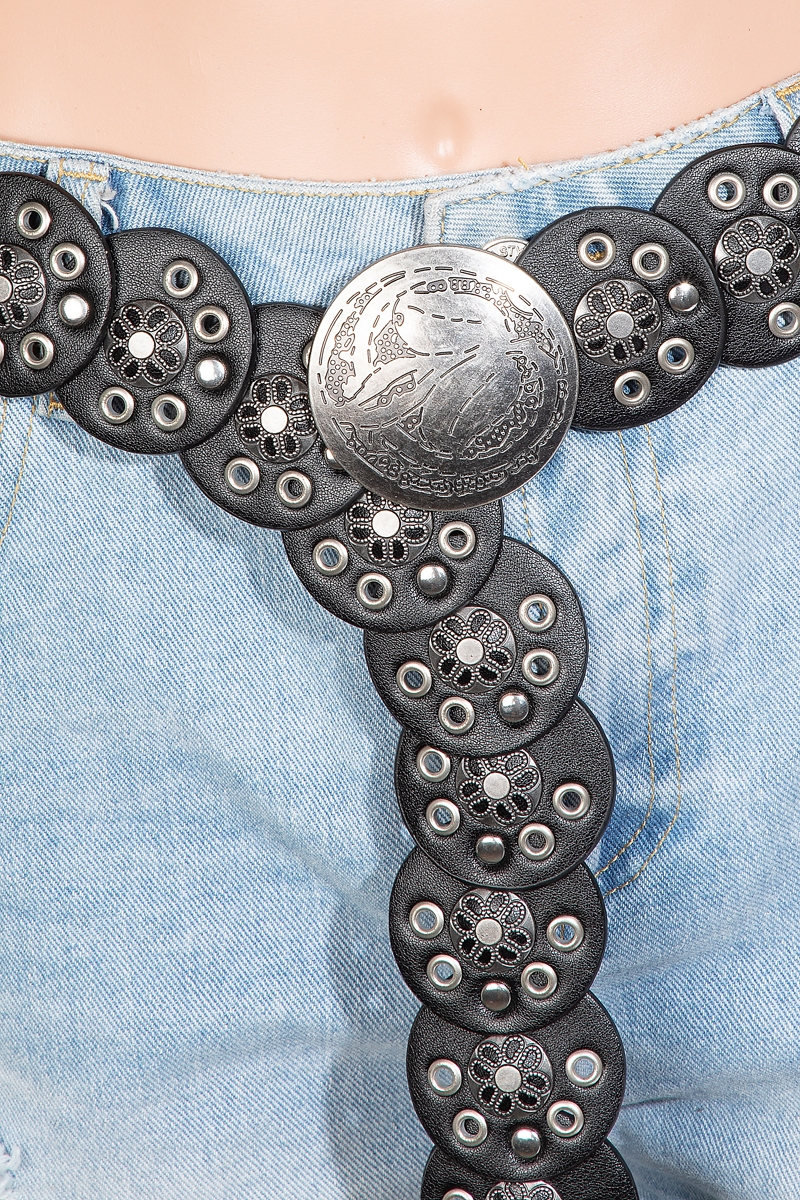 - This chain belt showcases a unique faux leather grommet disc style. Step into a world of refined taste as this chain belt effortlessly refines the details of your outfit.