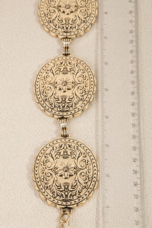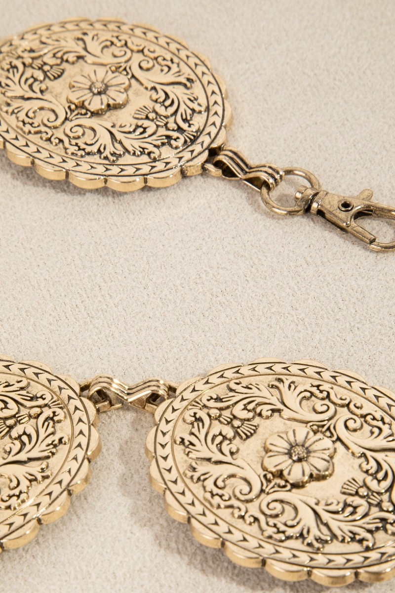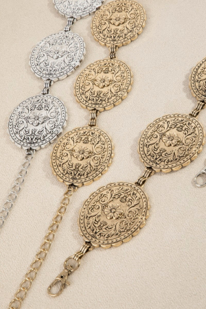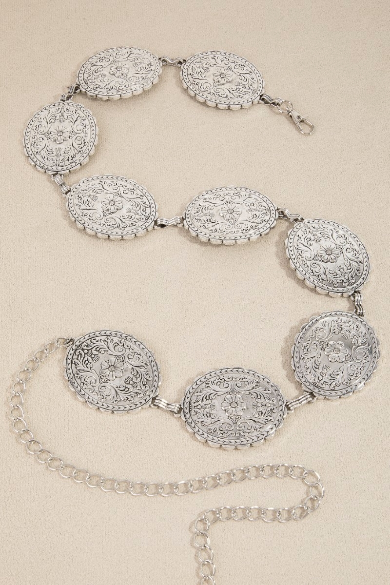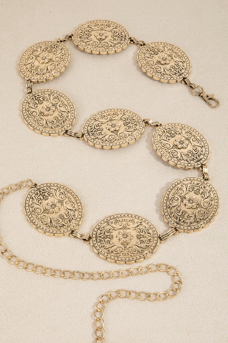 - This chain belt brings a unique floral concho style. Savor the allure of detailed craftsmanship in this exquisite chain belt.