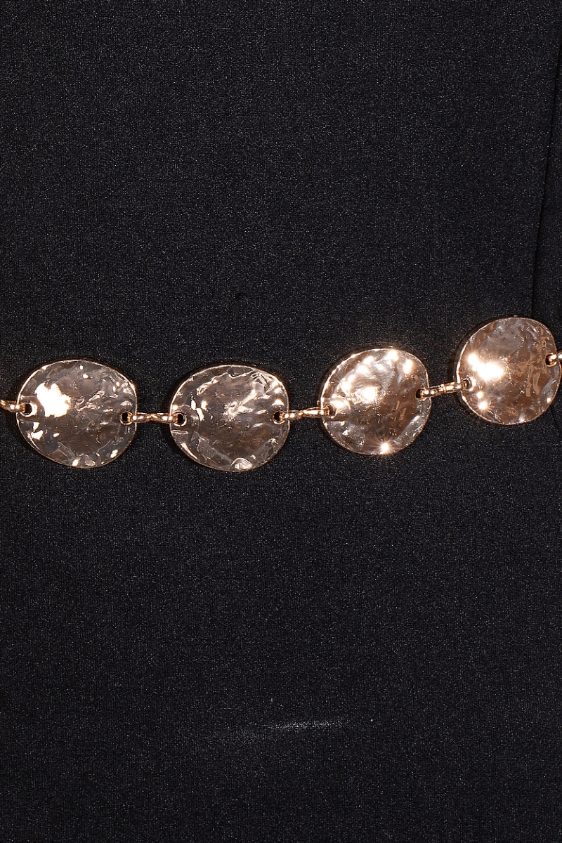 - This chain belt brings a unique hammered metallic discs style. Elevate your ensemble with this chic, timeless chain belt.