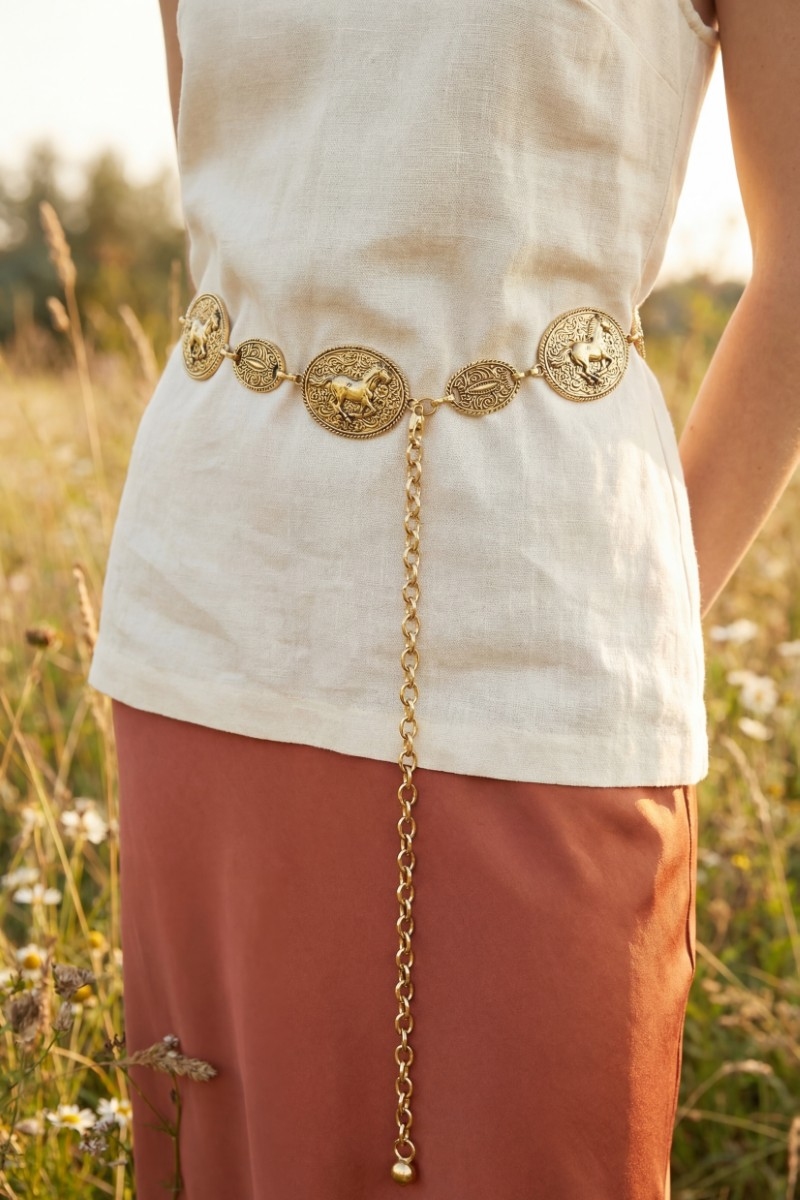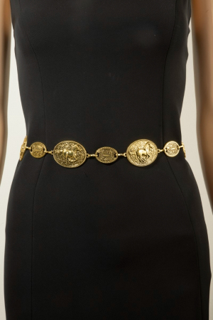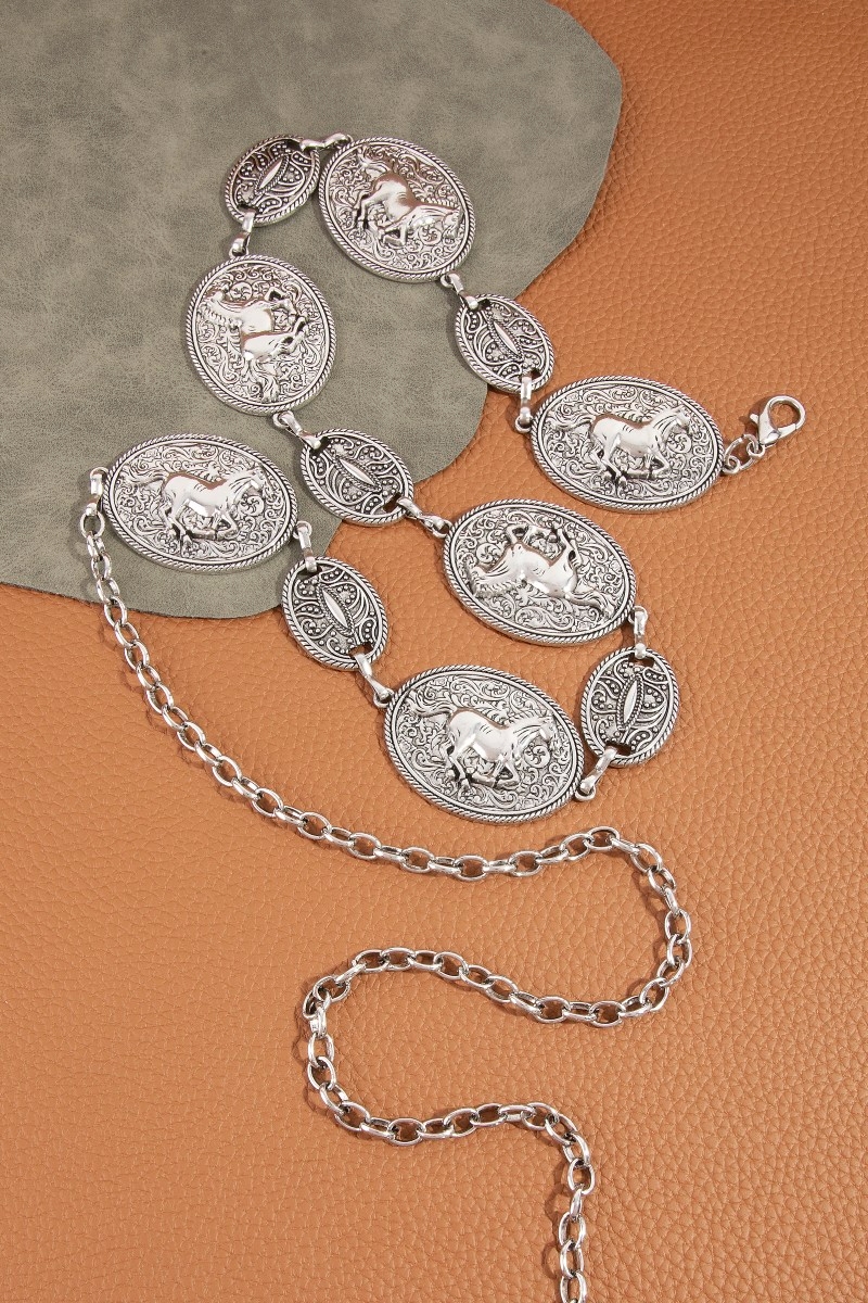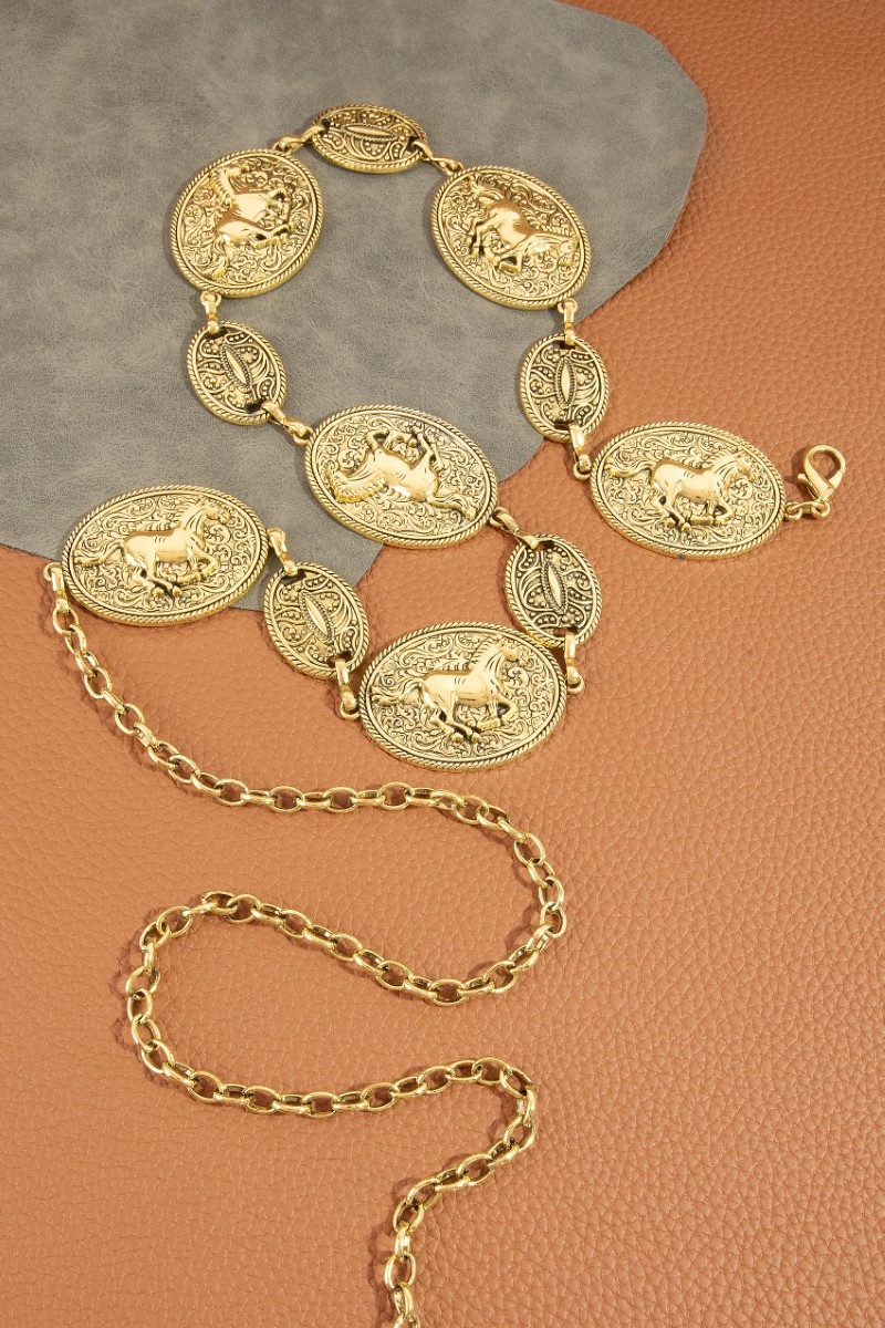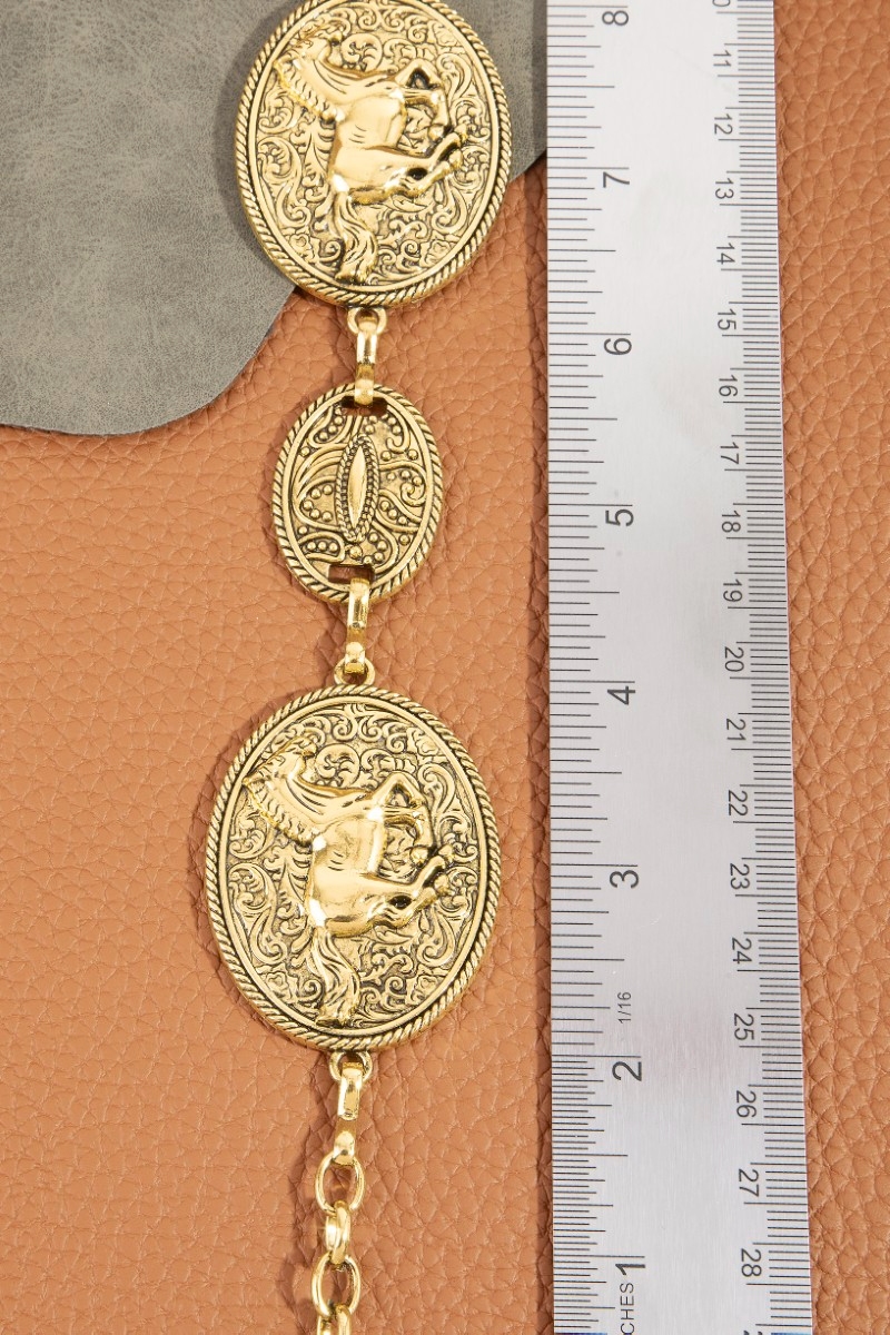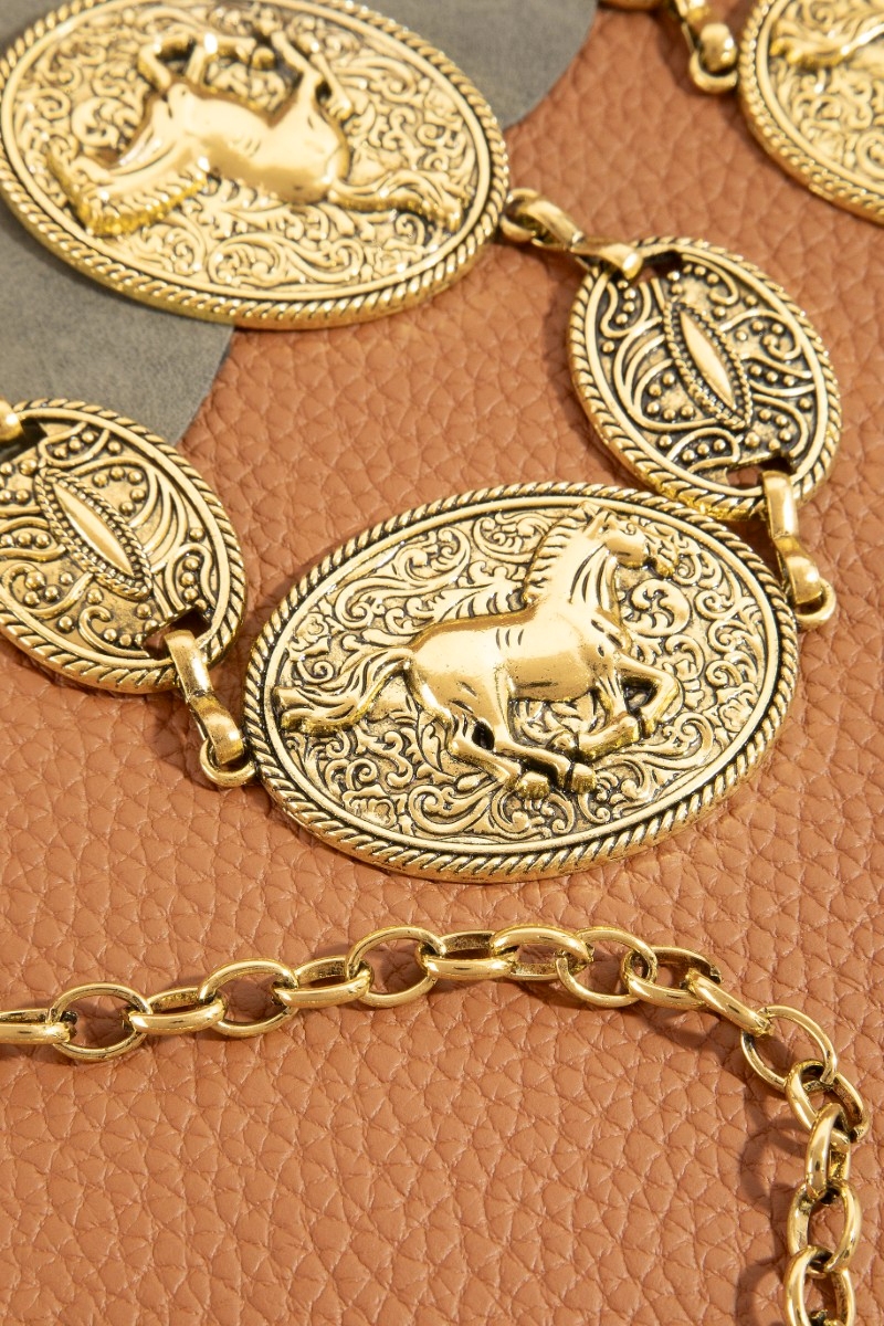 - This chain belt features a fashionable horse & rider oval medallion style. Step into a world of refined taste as this chain belt effortlessly refines the details of your outfit.