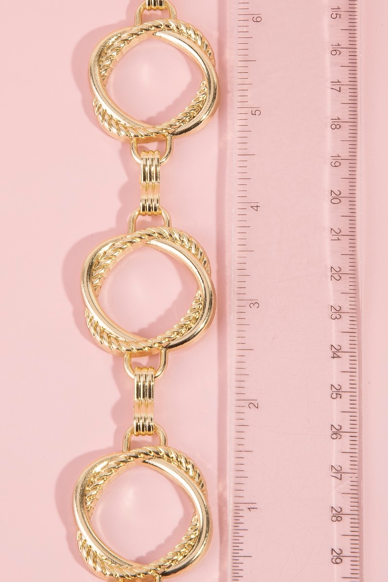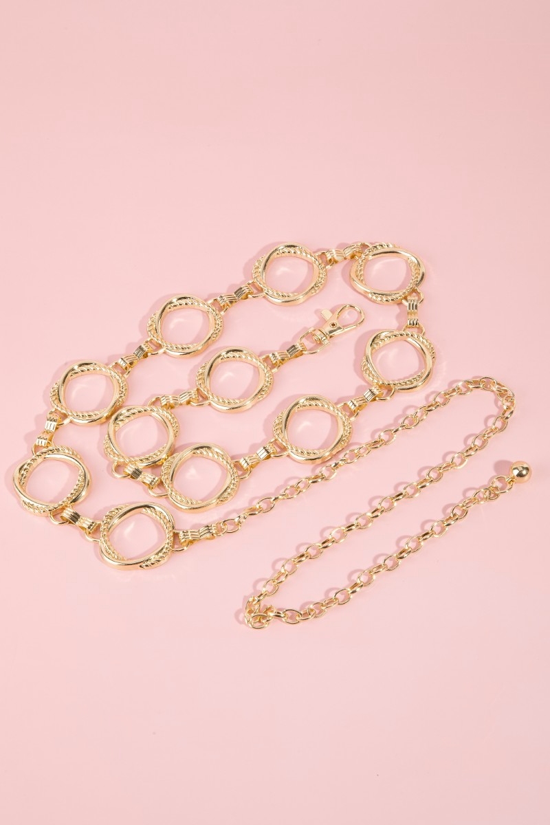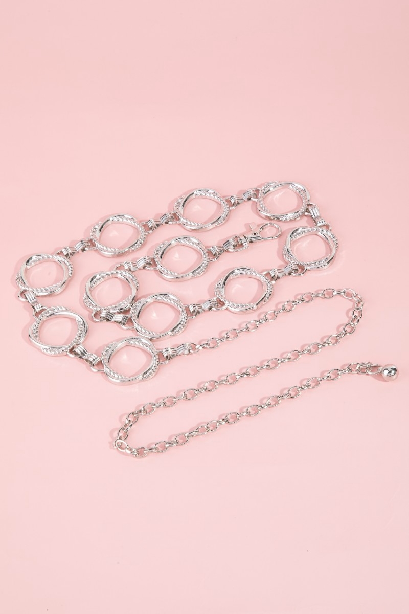 - This chain belt brings a unique intricate interlinked hoop style. Experience refined sophistication with this understated yet stylish piece.