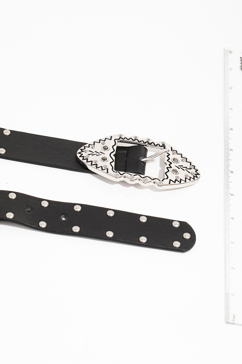• This belt adds a modern intricate metallic western oval buckle style. Discover the perfect balance of subtlety and flair as this belt effortlessly completes your look.