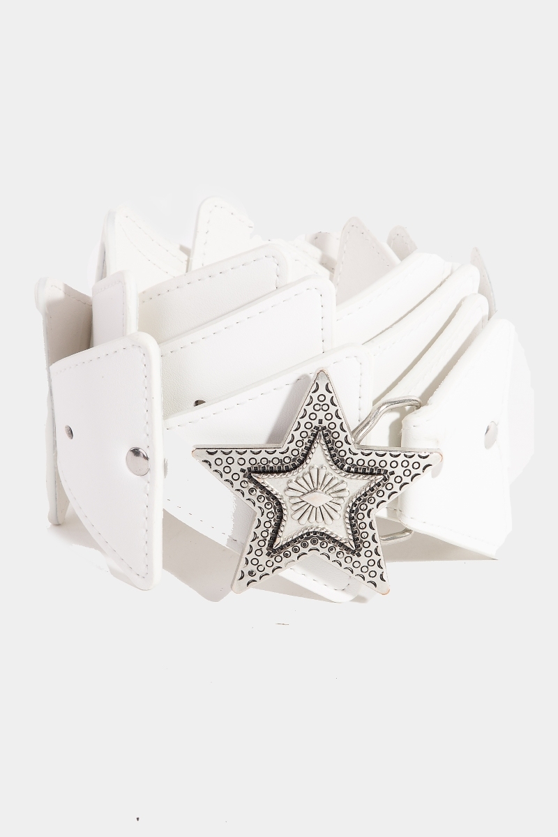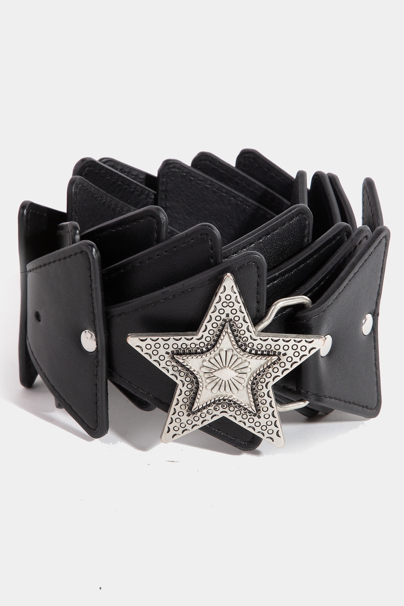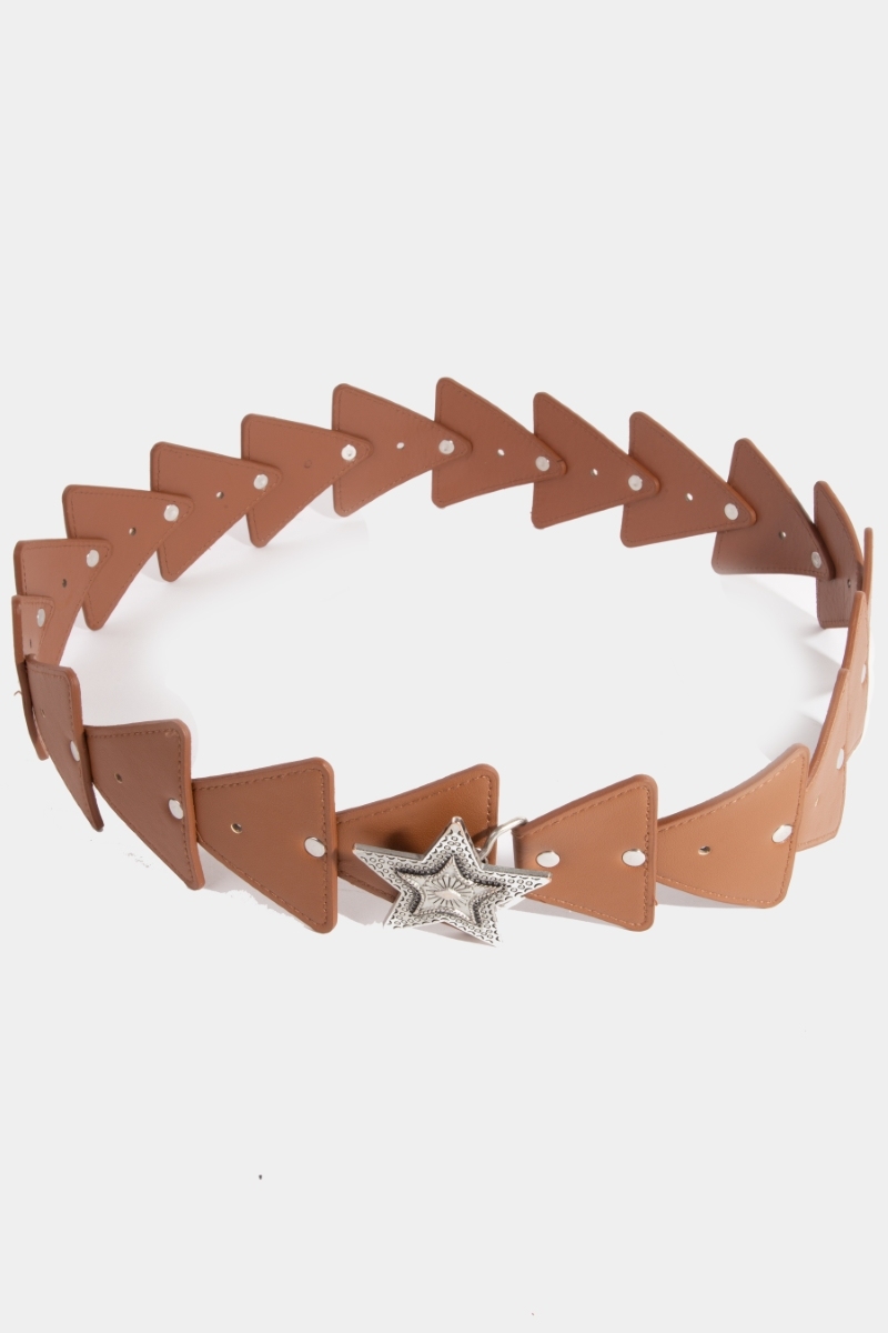 • This faux leather belt brings a stunning intricate star buckle triangle faux leather chain belt style. Elevate your ensemble with this faux leather belt that effortlessly captures the essence of refined fashion.