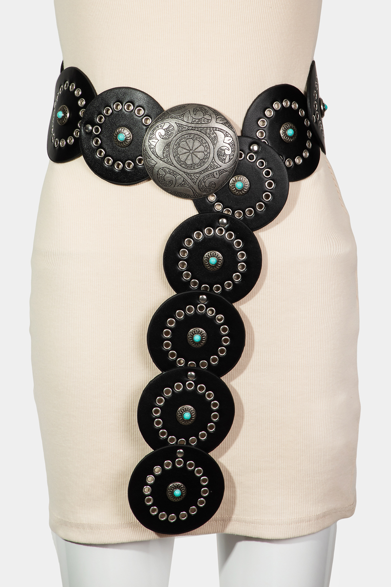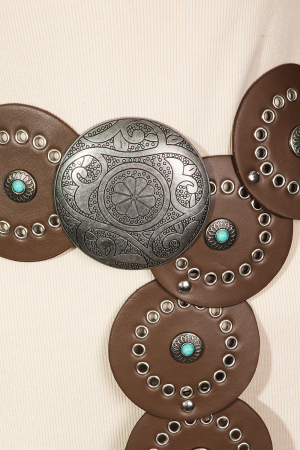• This belt brings a stunning large circle western disc link fashion style. Immerse yourself in the world of understated glamour as this belt effortlessly exudes timeless appeal.