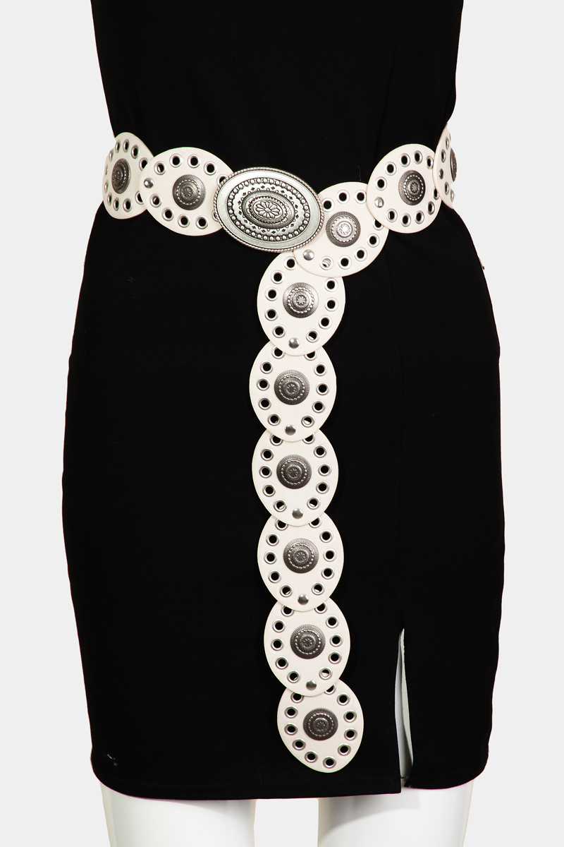 - This belt showcases a timeless large ornate western oval disc style. Embark on a journey of sartorial refinement as this belt effortlessly complements your fashion sense.