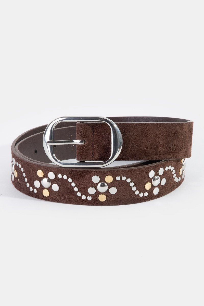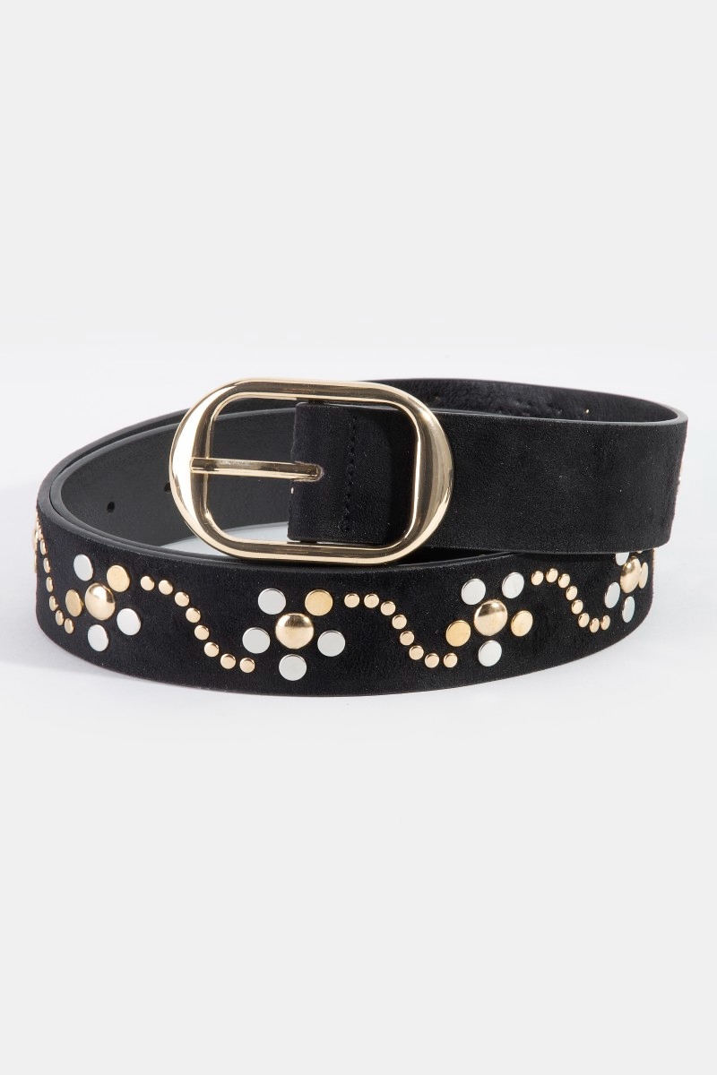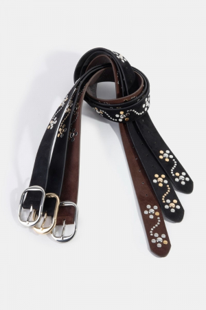 - This leather belt showcases a timeless floral studded detail vegan style. Immerse yourself in the world of understated glamour as this leather belt effortlessly exudes timeless appeal.