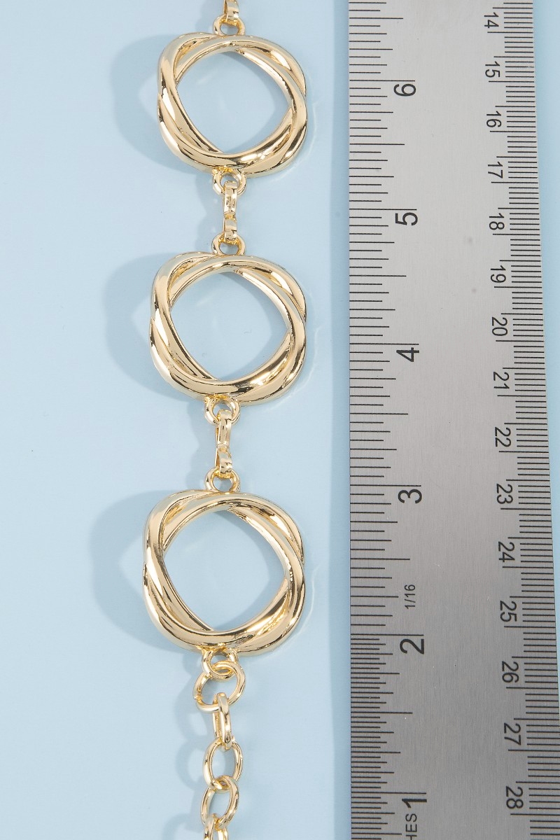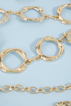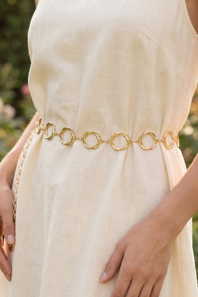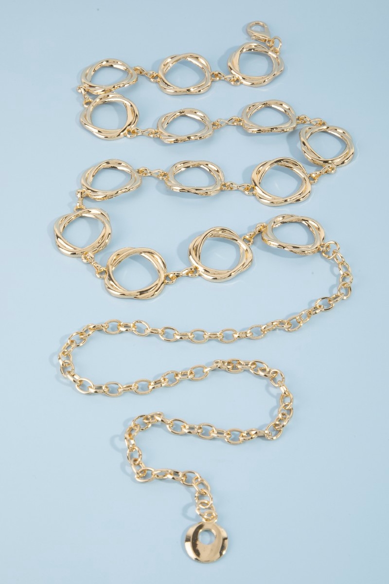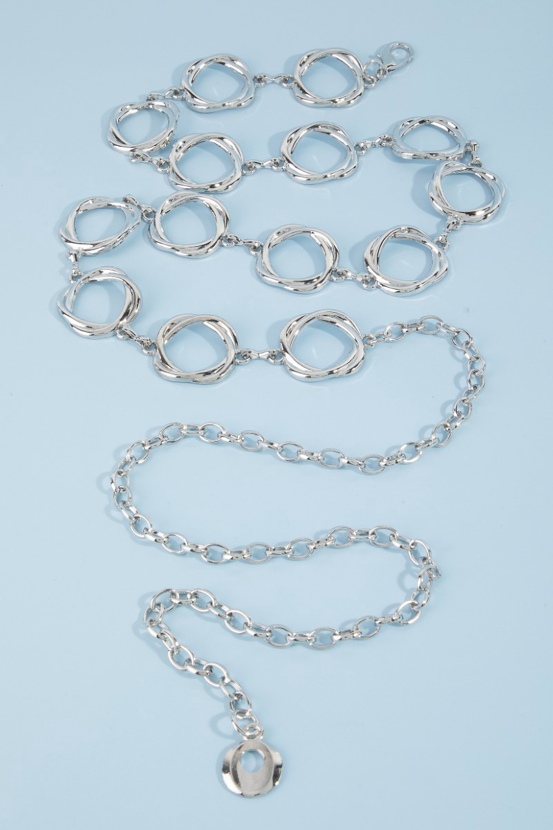 • This chain belt adds a modern organic freeform open circle link style. Revel in the intricate design that effortlessly distinguishes this chain belt, making it a statement piece.