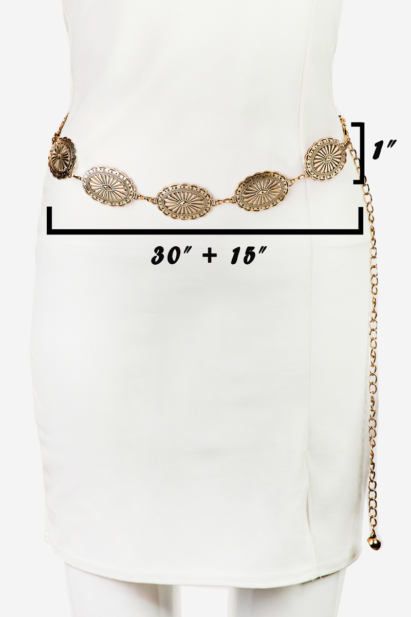 - This belt displays a vibrant oval concho disc chain link style. Celebrate the art of accessorizing with this piece that effortlessly encapsulates modern trends.