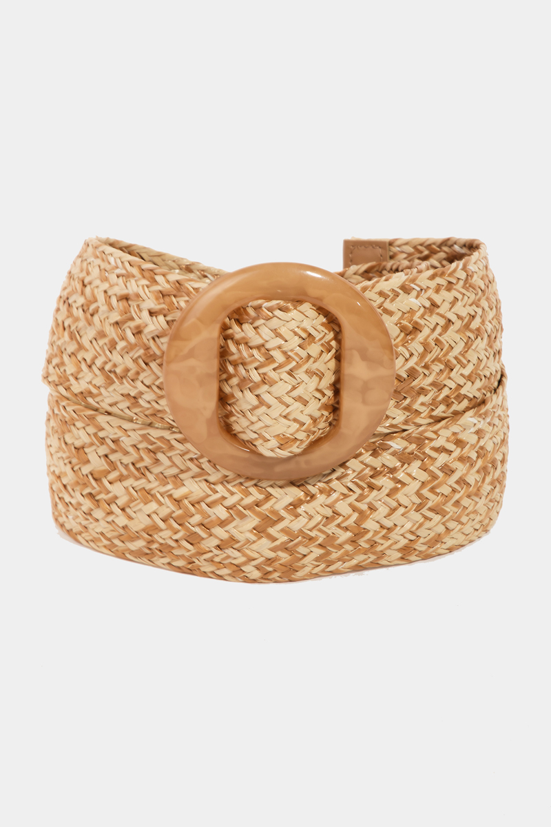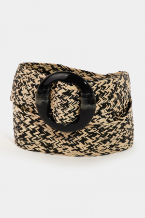 • This braided belt displays a vibrant resin buckle style. Indulge in the artistry of accessorizing with this unique piece.