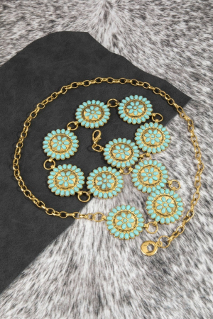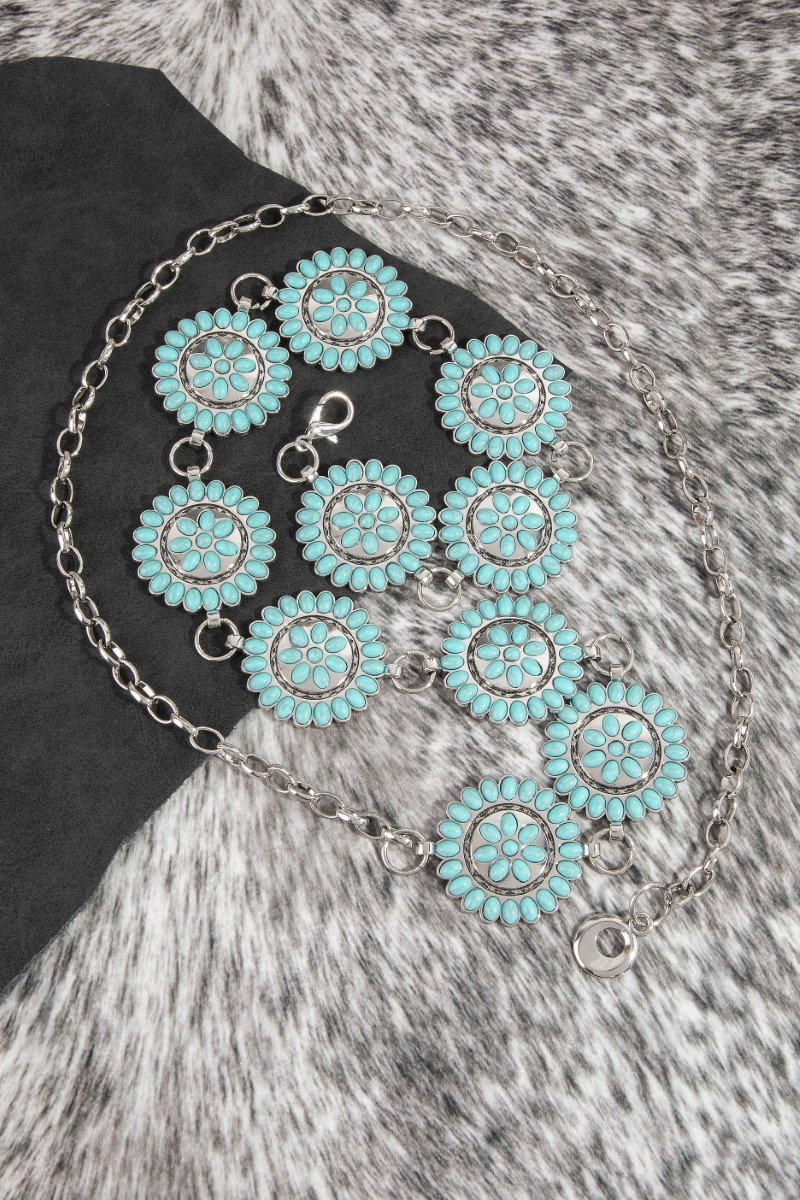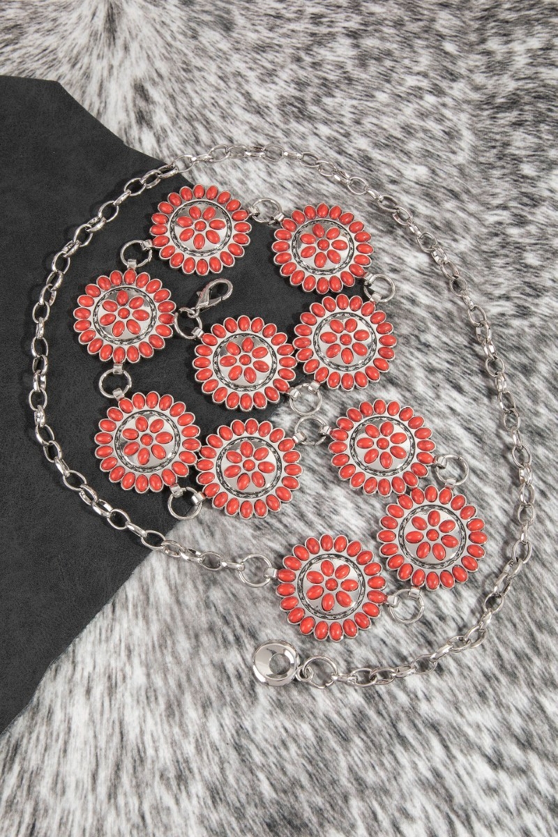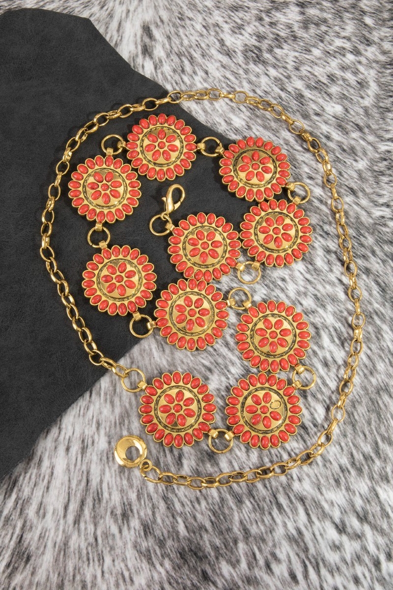 - This chain belt showcases a unique round stone bead concho style. Redefine your look effortlessly with this standout, on-trend piece.