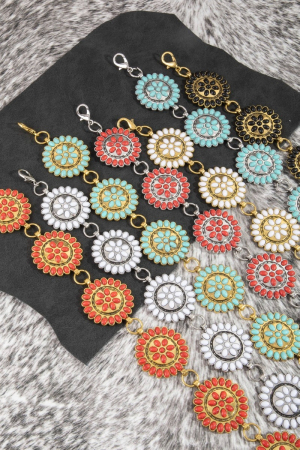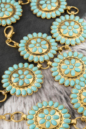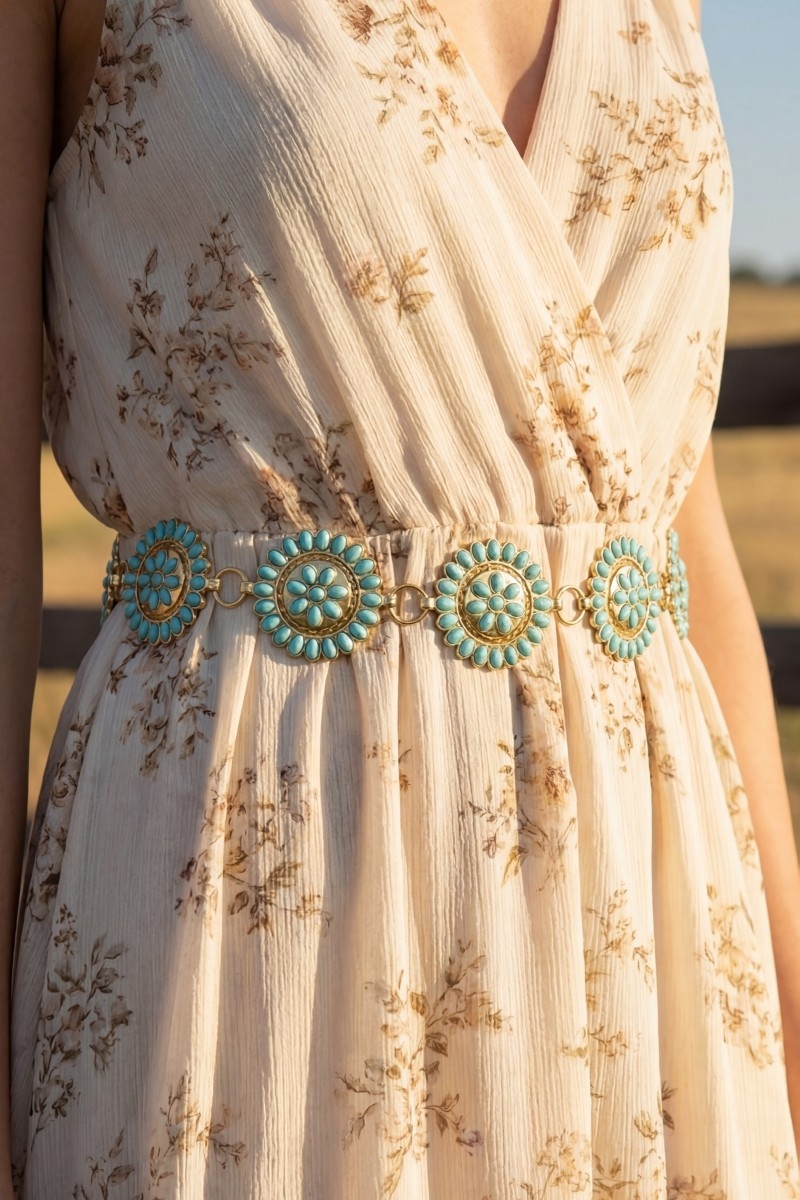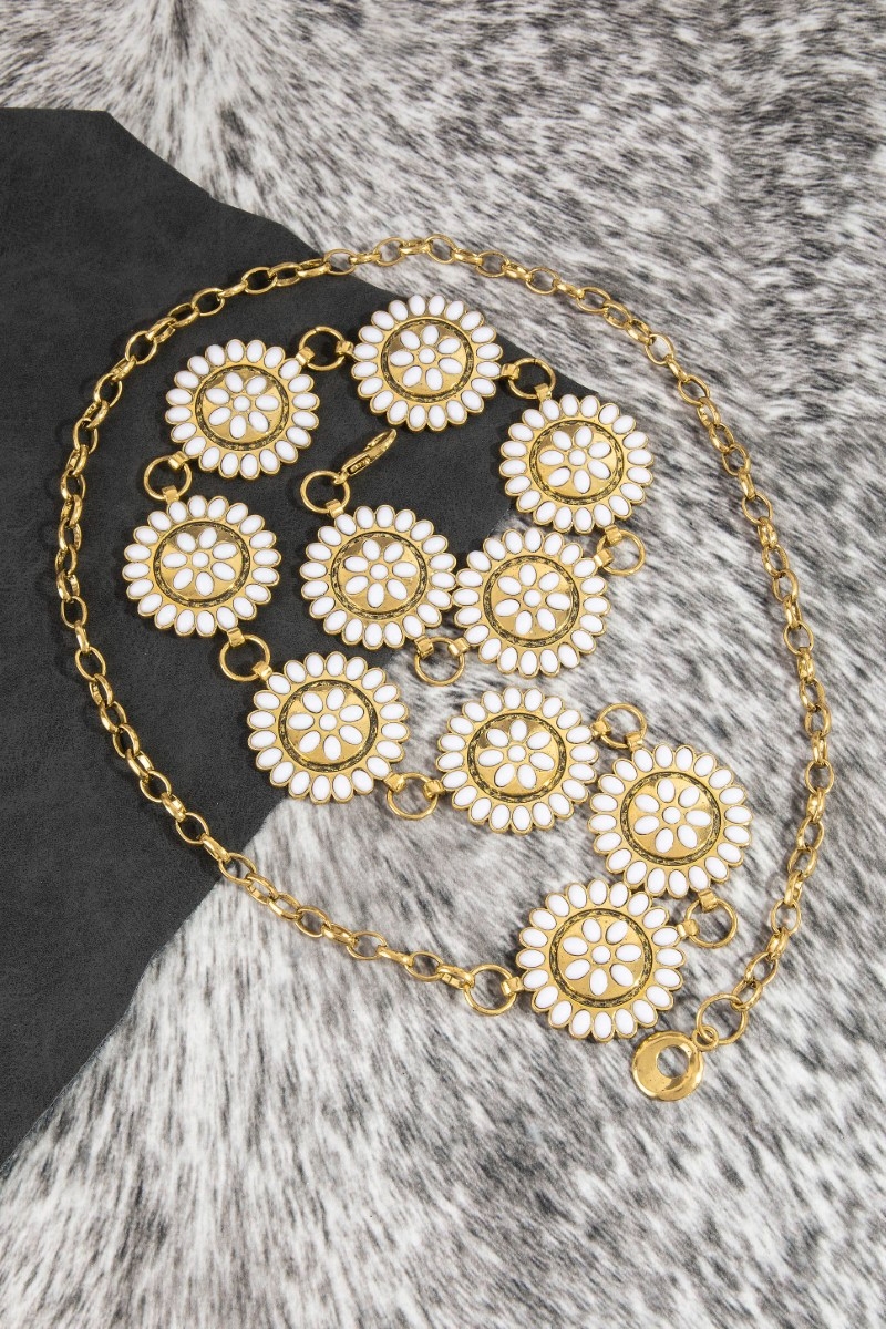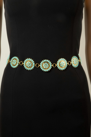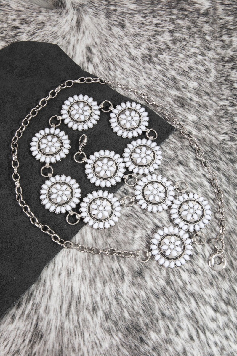 - This chain belt showcases a unique round stone bead concho style. Redefine your look effortlessly with this standout, on-trend piece.
